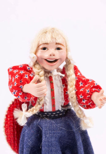 Dollhouse Miniature ~ Artisan Made Porcelain Blonde Hair Little Girl Doll in Apron & Blue Dress
