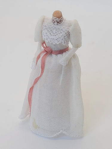 Handmade White Lacey Dress with Pink Ribbon on Mannequin