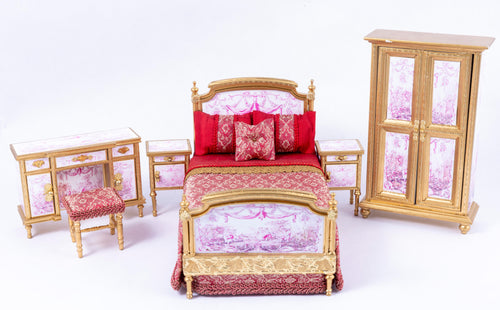 9 Piece Bedroom Set with Brass Canopy Bed and Pink Linens