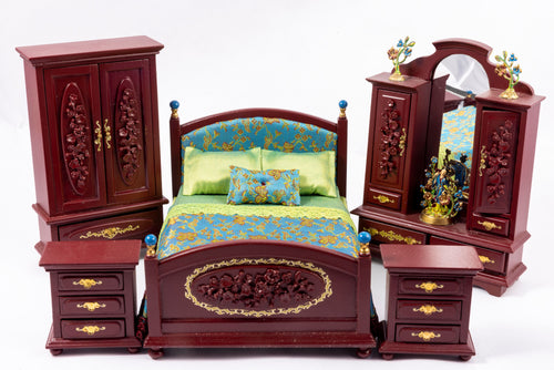 5 Piece Mahogany East Asian Bedroom Set with Green Linens