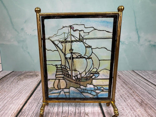 Vintage Artisan Handmade Stained Glass Nautical Sailboat Fireplace Screen