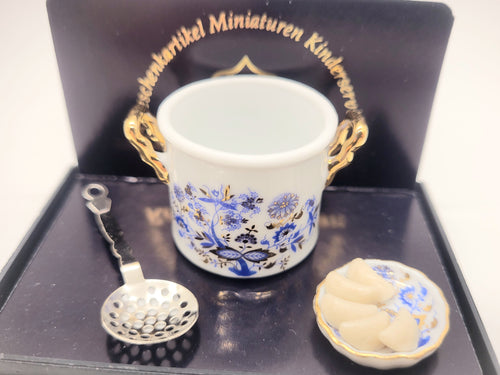 Dollhouse Miniature ~ 1:12 Scale, Dumplings and Blue Onion Pattern Pot and Ladle by Reutter Porcelain