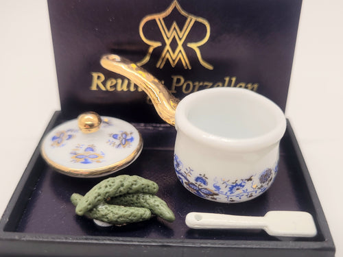 Dollhouse Miniature ~ 1:12 Scale, Blue Onion Pattern Pot with Cucumbers and Spatula, by Reutter Porcelain