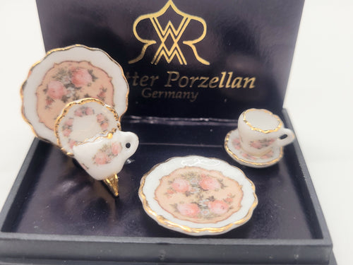 Dollhouse Miniature ~ 1:12 Scale, 5pc Tea Set w/ Pink Rose and Gold-Trimmed Plates - by Reutter Porcelain