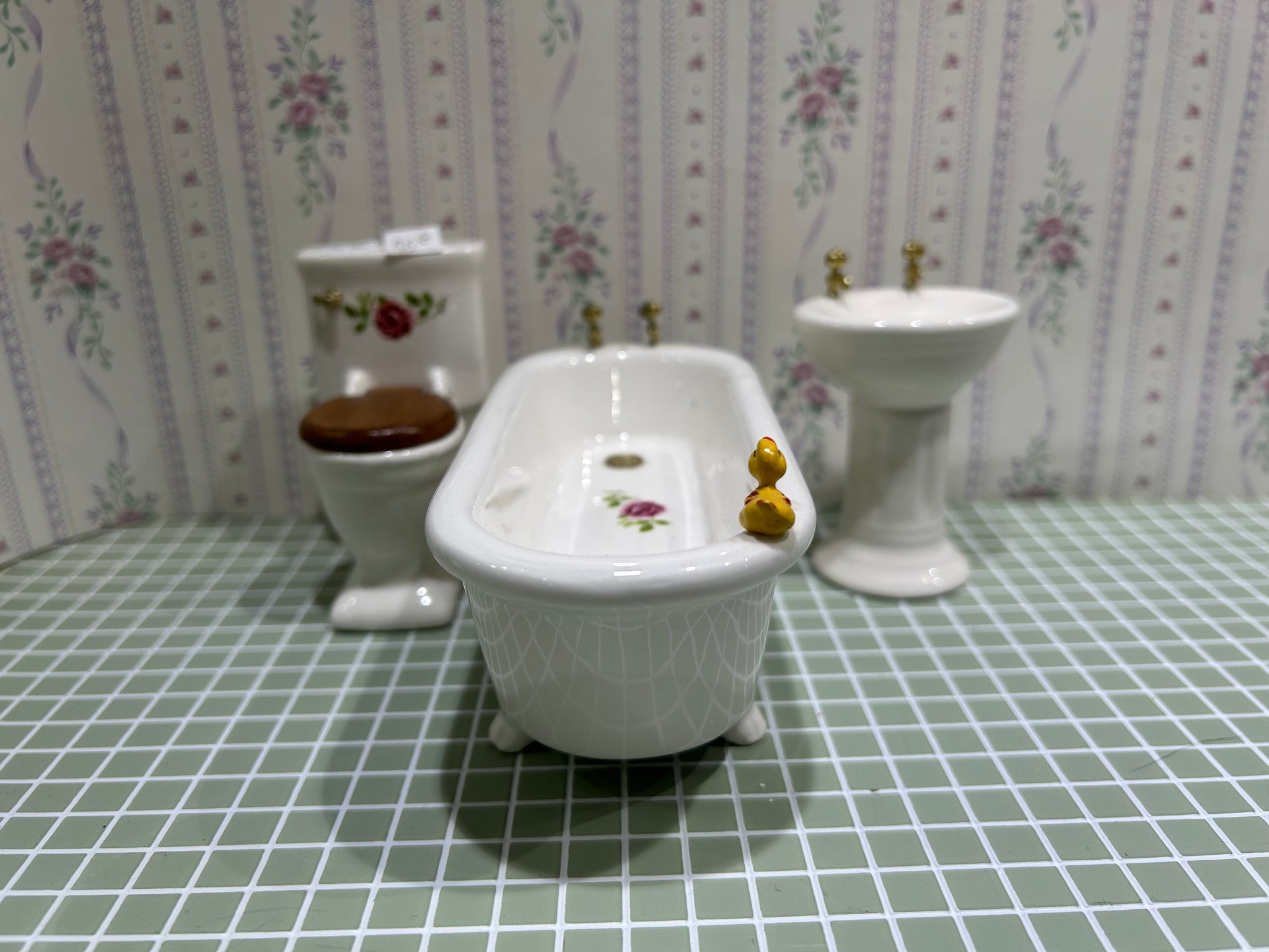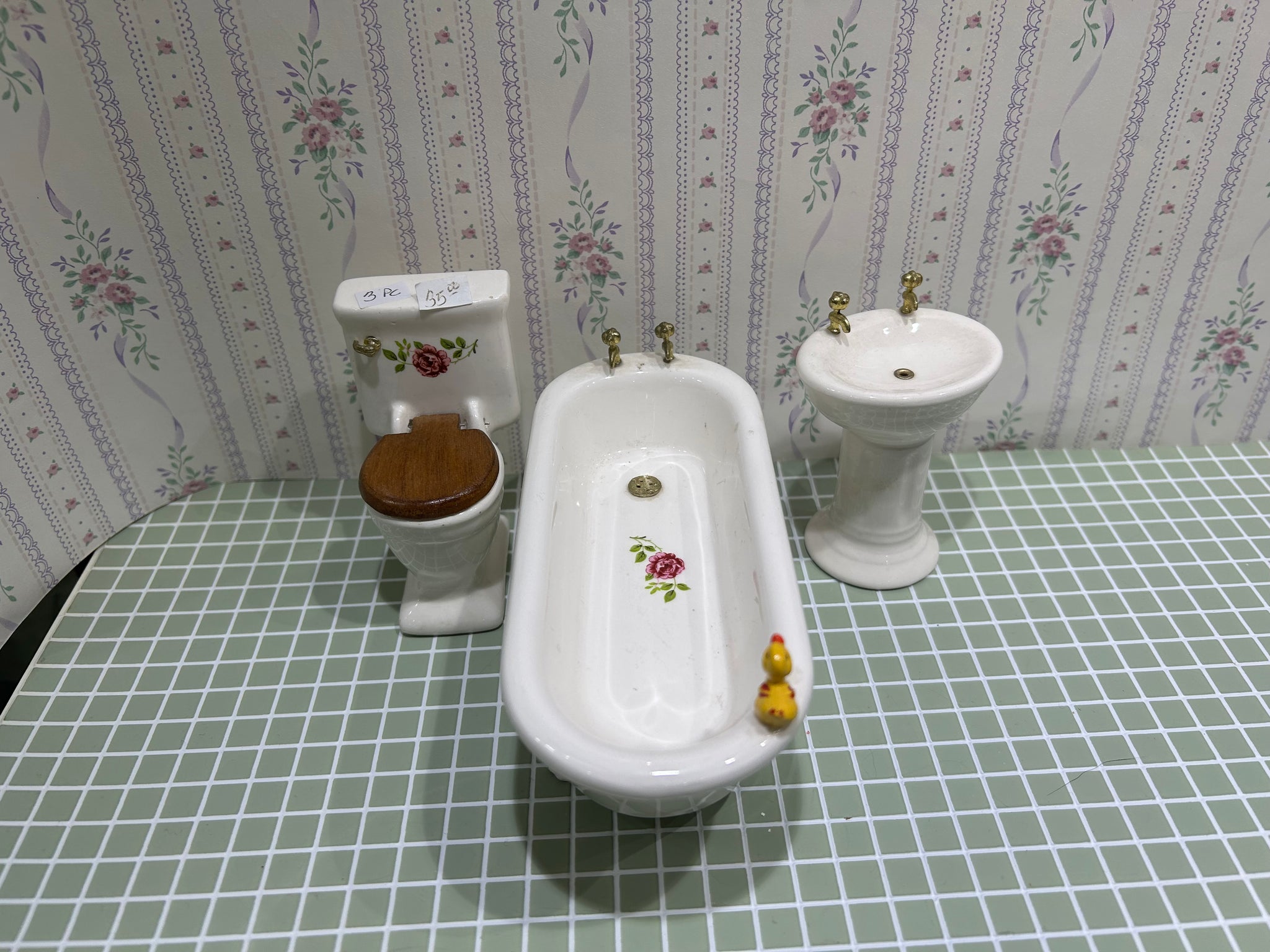 this is a three-piece vintage porcelain bath set with a rubber ducky. There’s a floral design and cute metal drain.