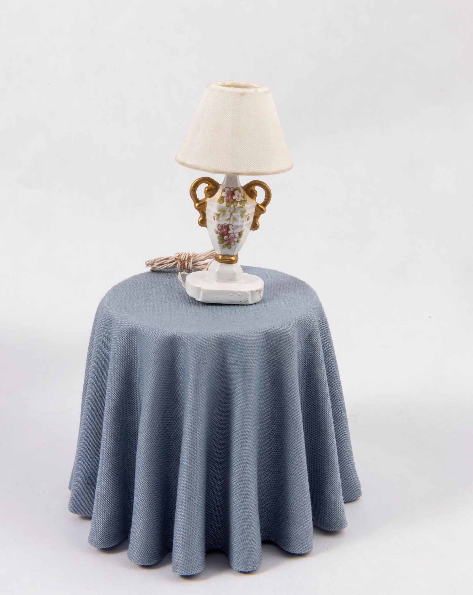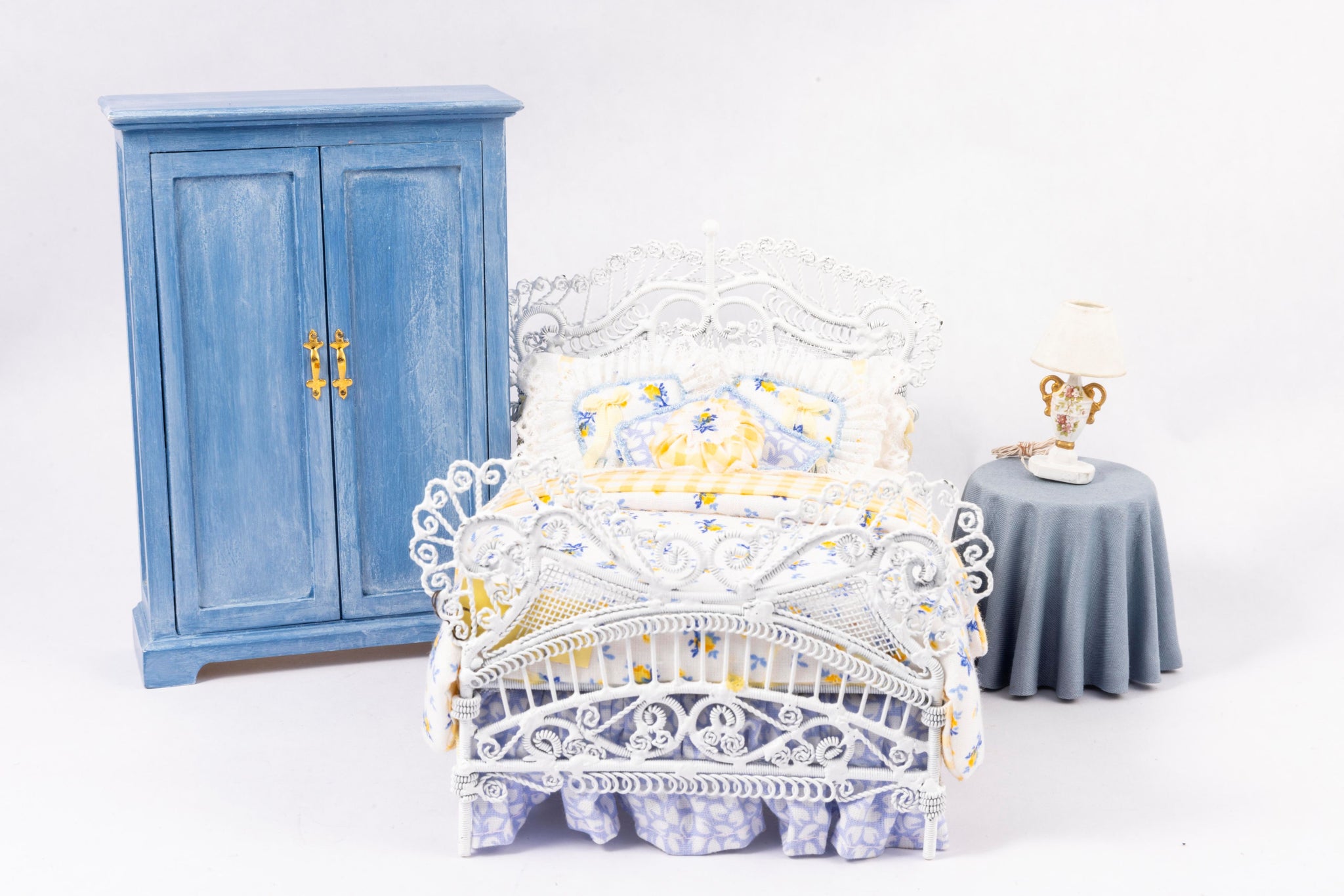 3 piece bedroom set with blue and yellow accents. Set includes bed, wardrobe, and table. Lamp is not included.