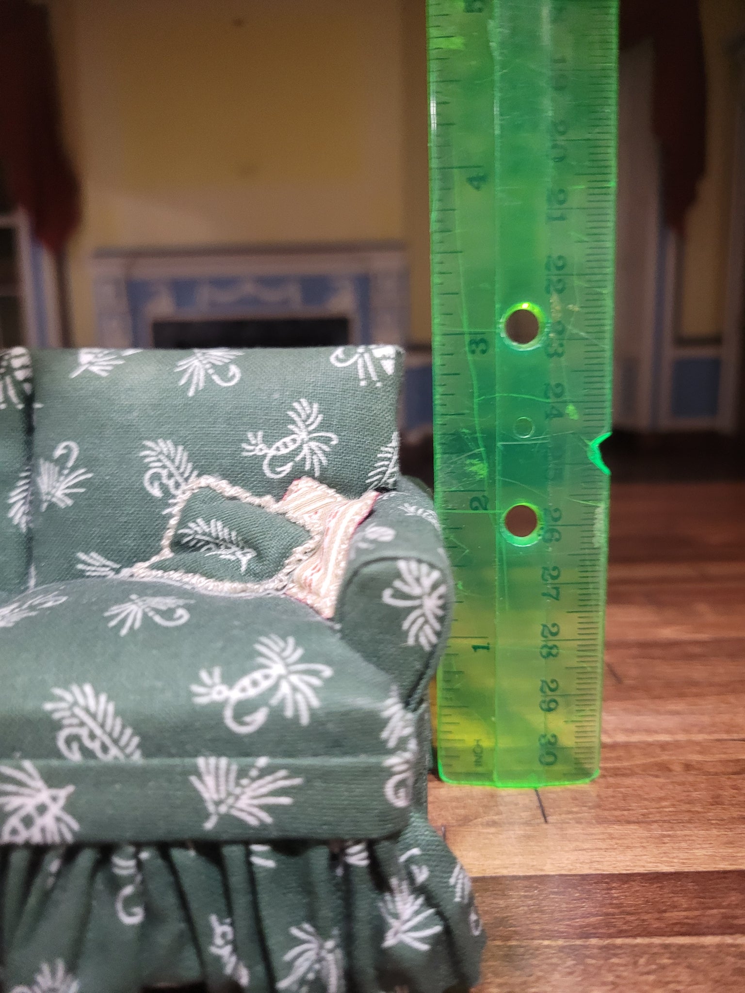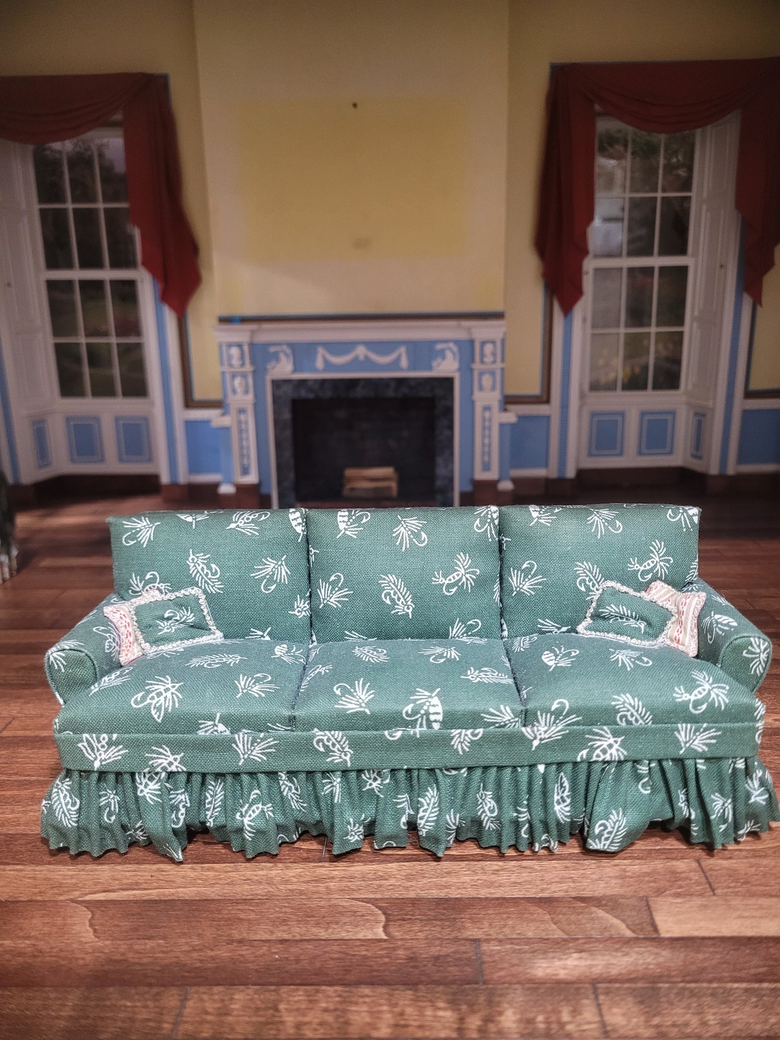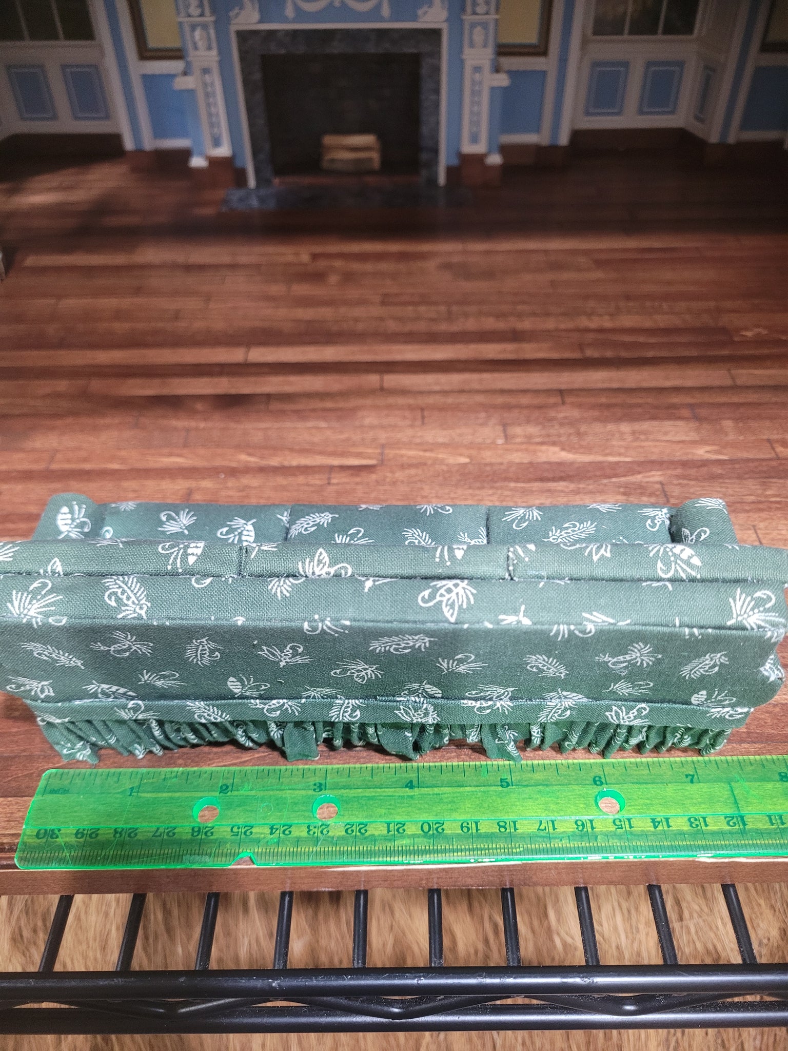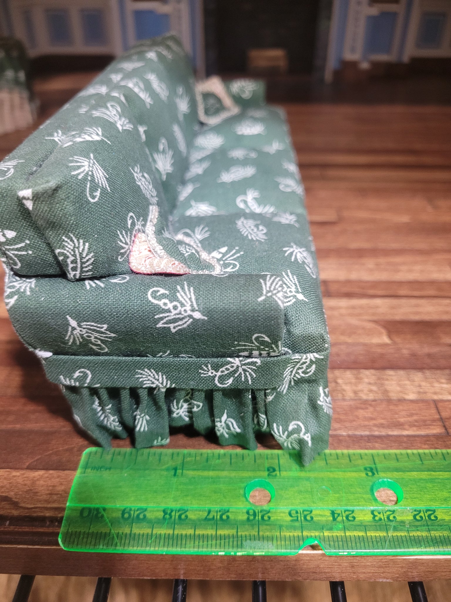 This is a Green & Cream Vegetation Patterned 3pc Living Room Set. 1 couch with 4 pillows, side arm chair with pillow, and table with tissues, magazines, food and chips.