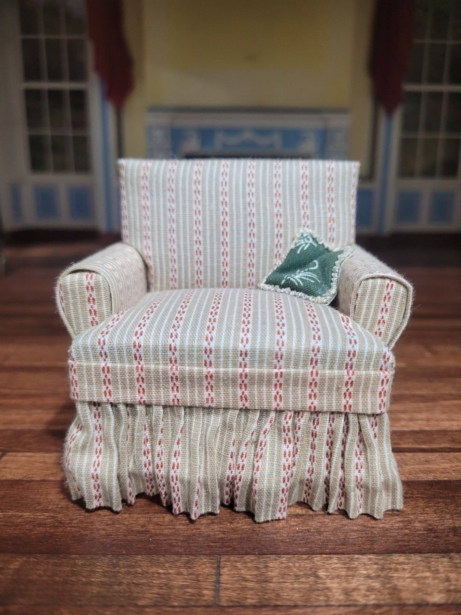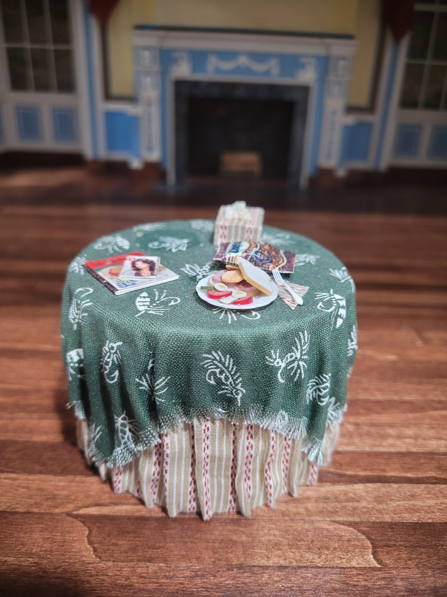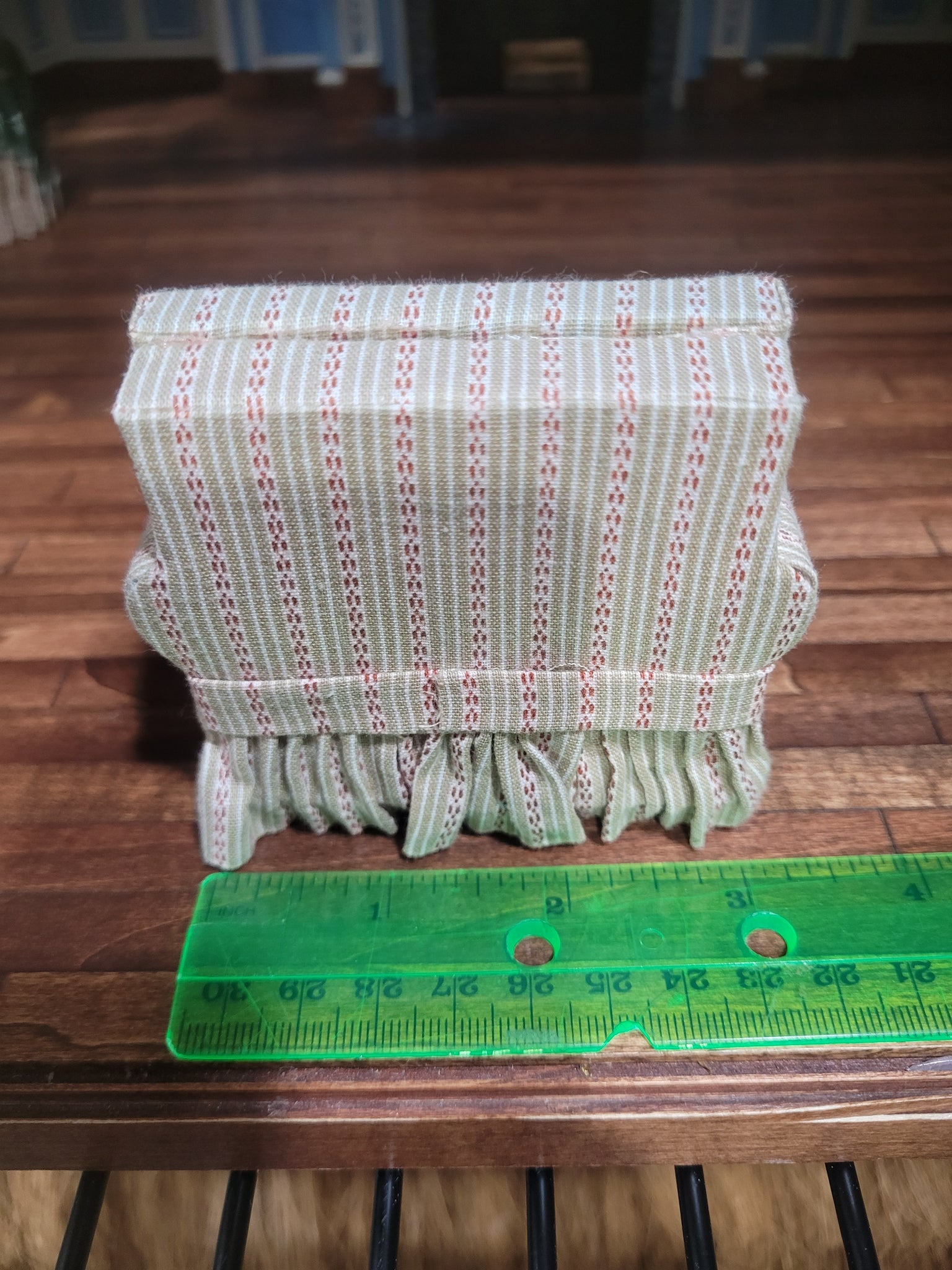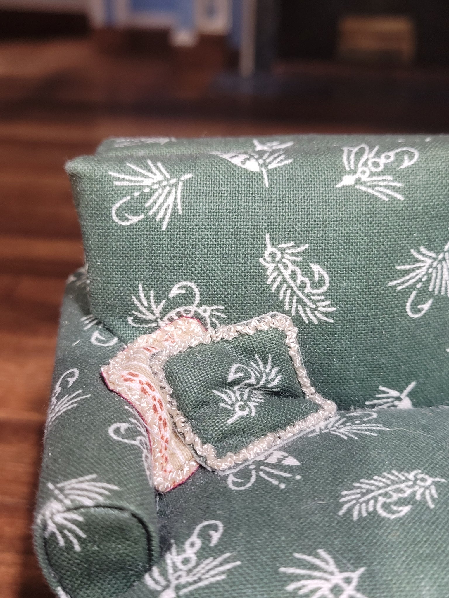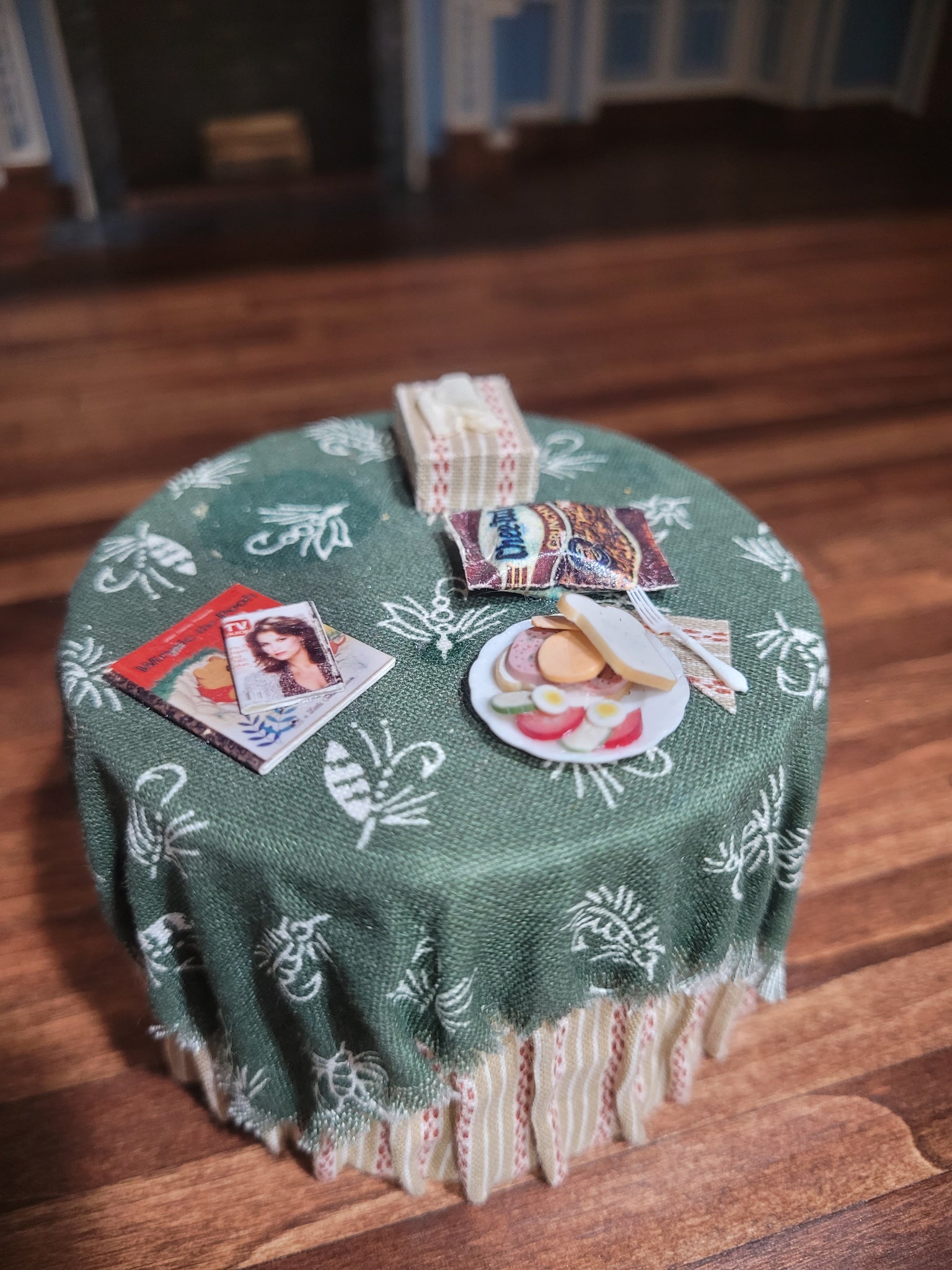 This is a Green & Cream Vegetation Patterned 3pc Living Room Set. 1 couch with 4 pillows, side arm chair with pillow, and table with tissues, magazines, food and chips.