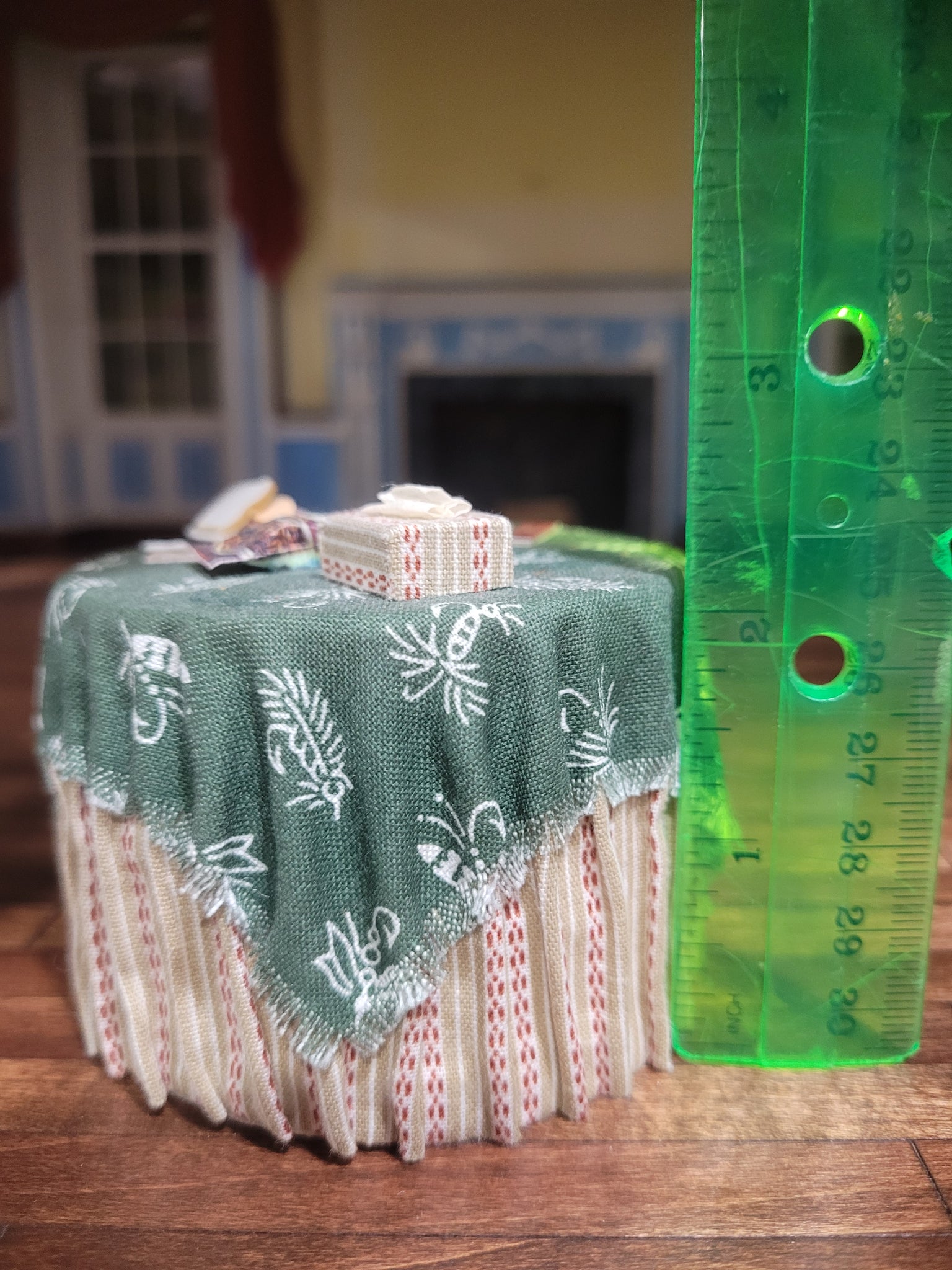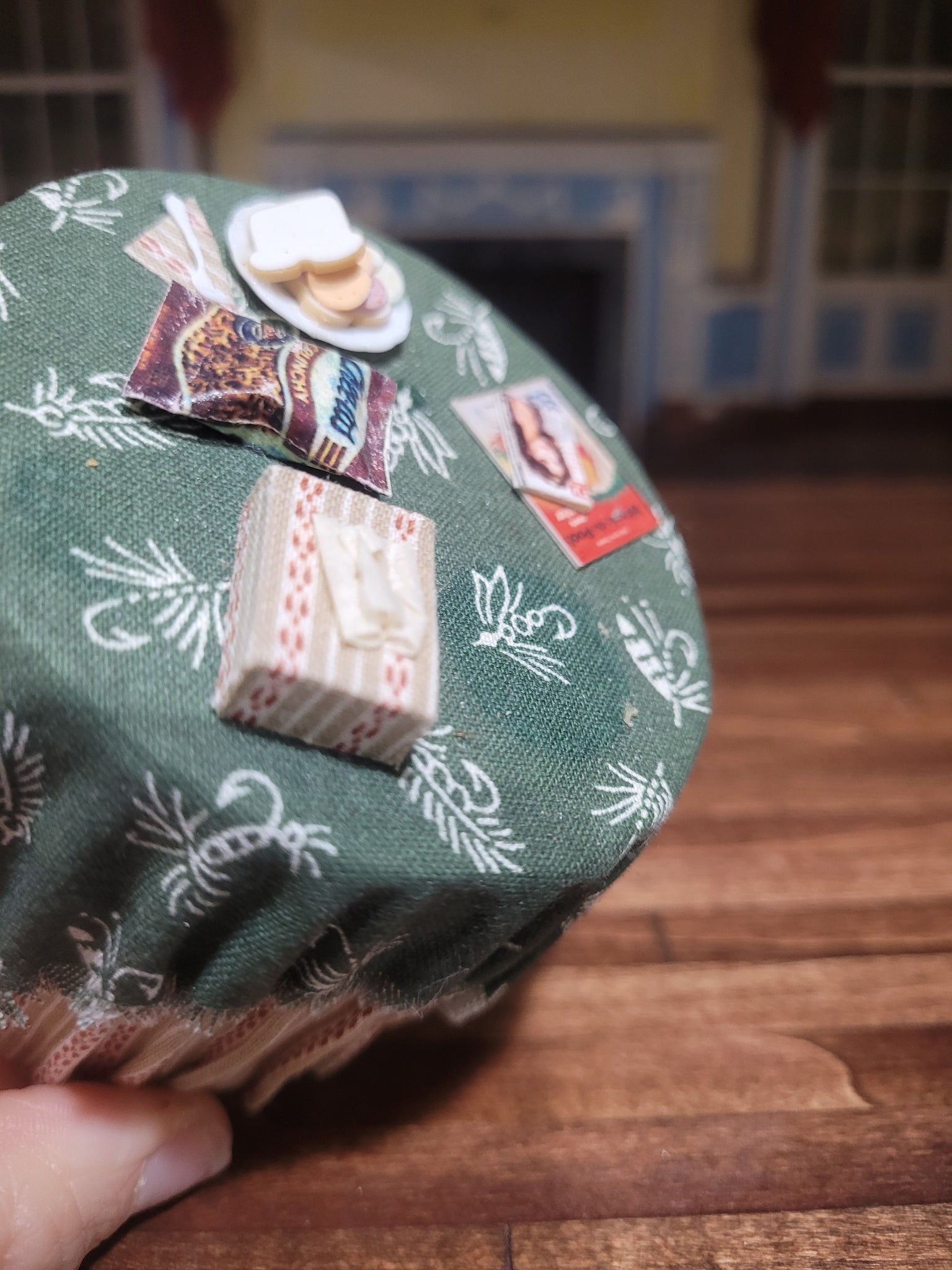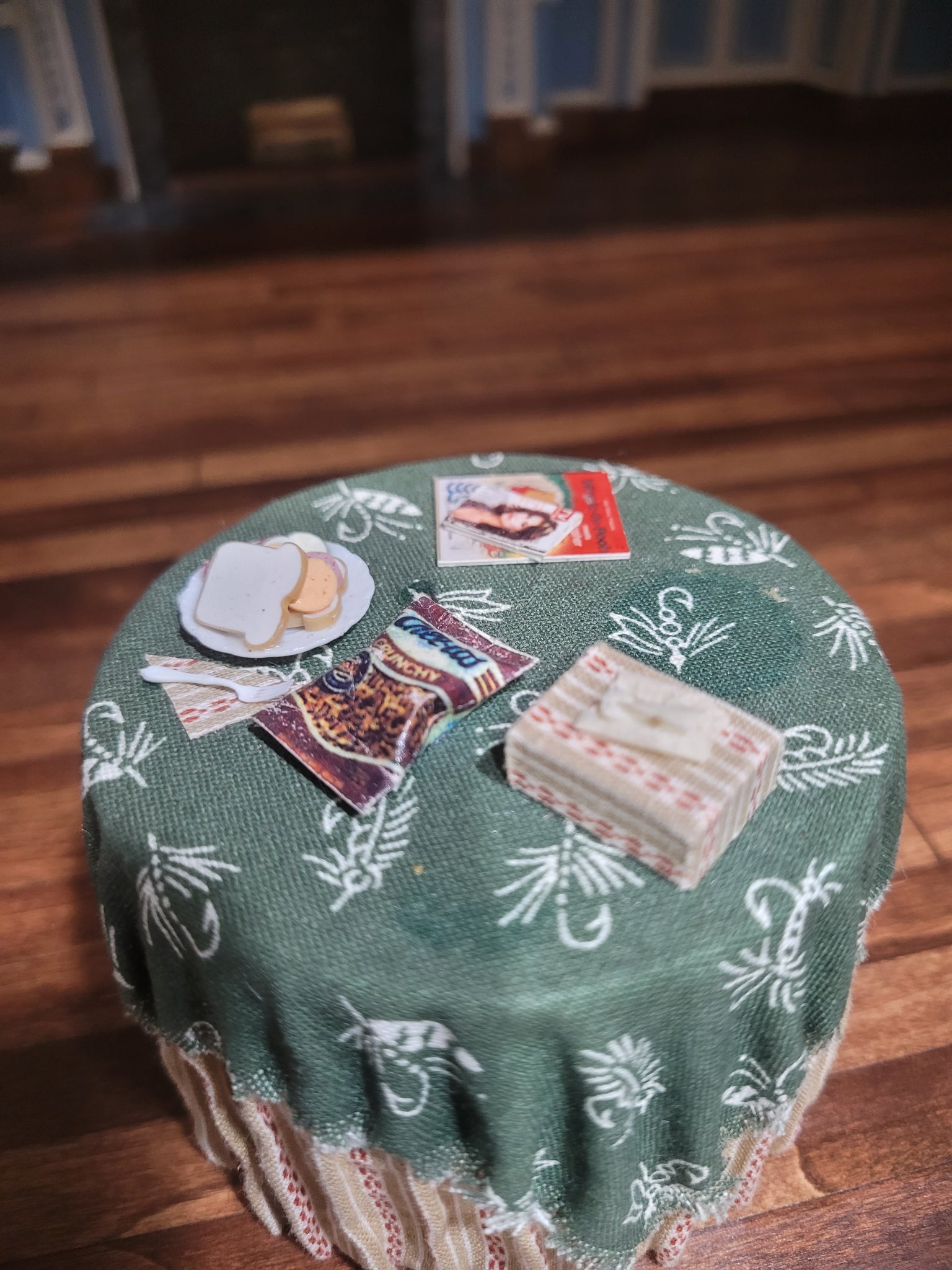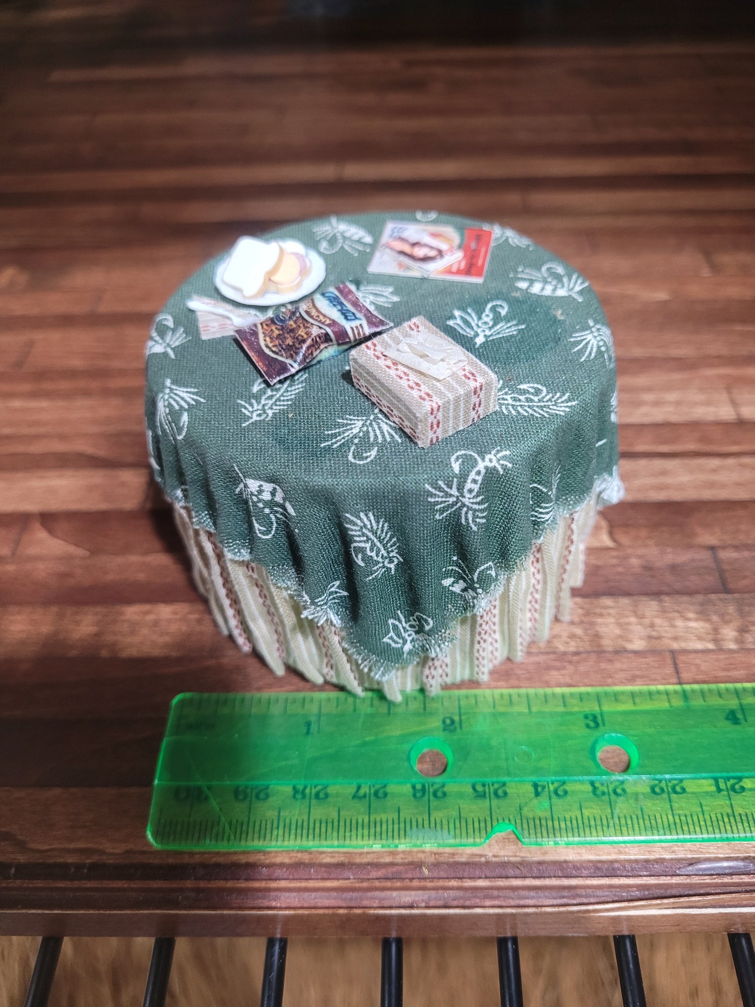 This is a Green & Cream Vegetation Patterned 3pc Living Room Set. 1 couch with 4 pillows, side arm chair with pillow, and table with tissues, magazines, food and chips.