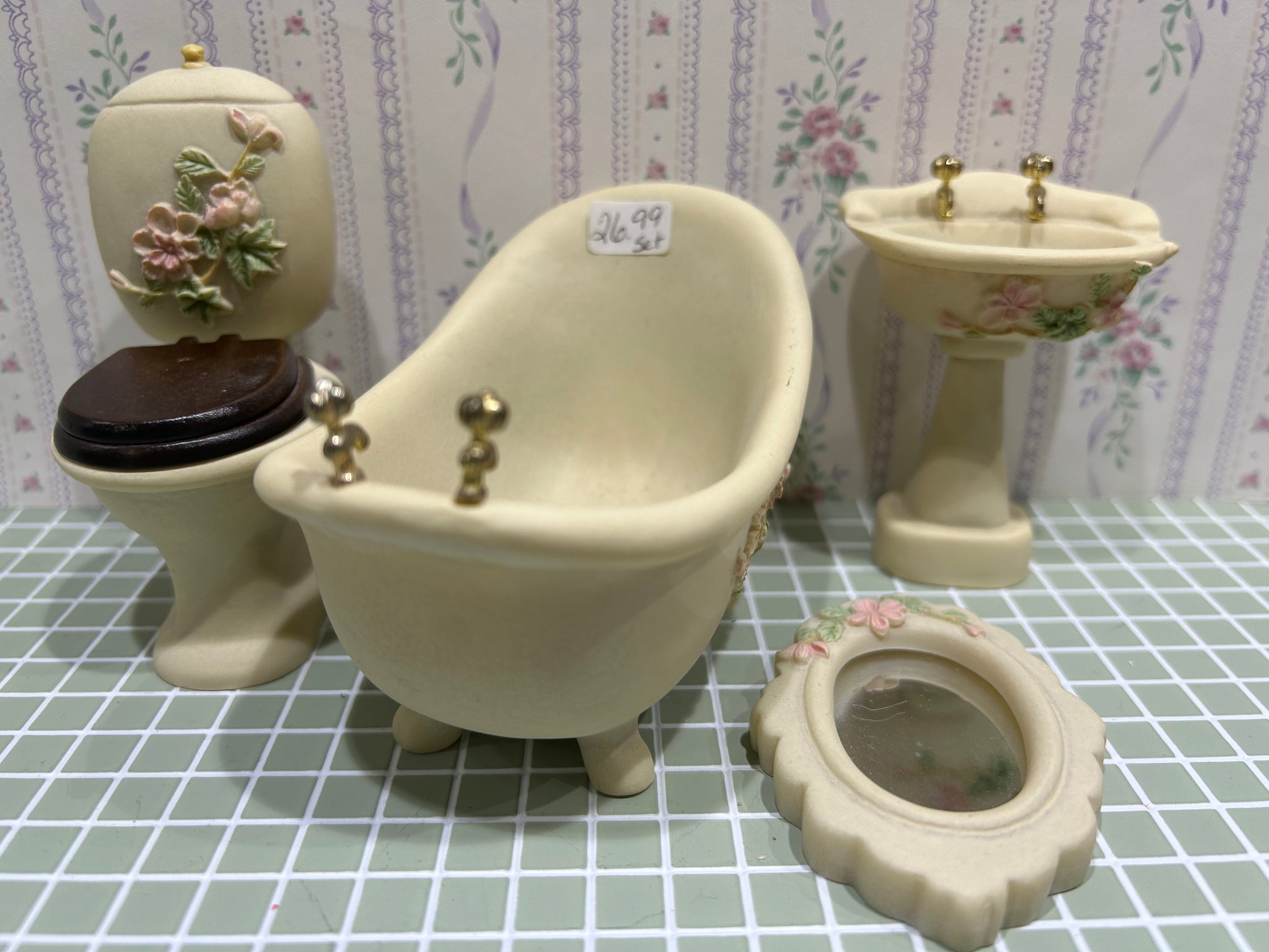 This is a four piece bathroom set with a floral design.