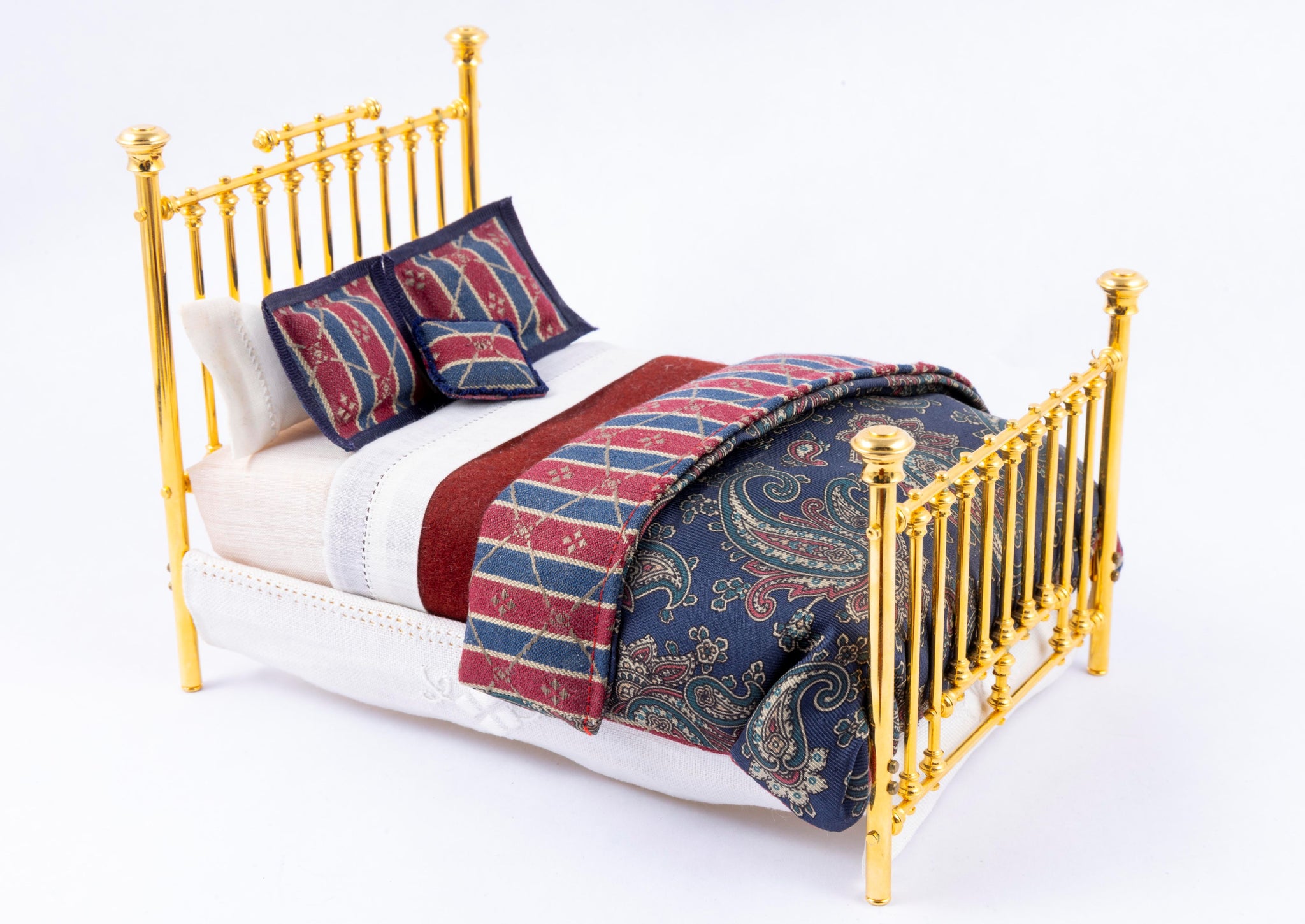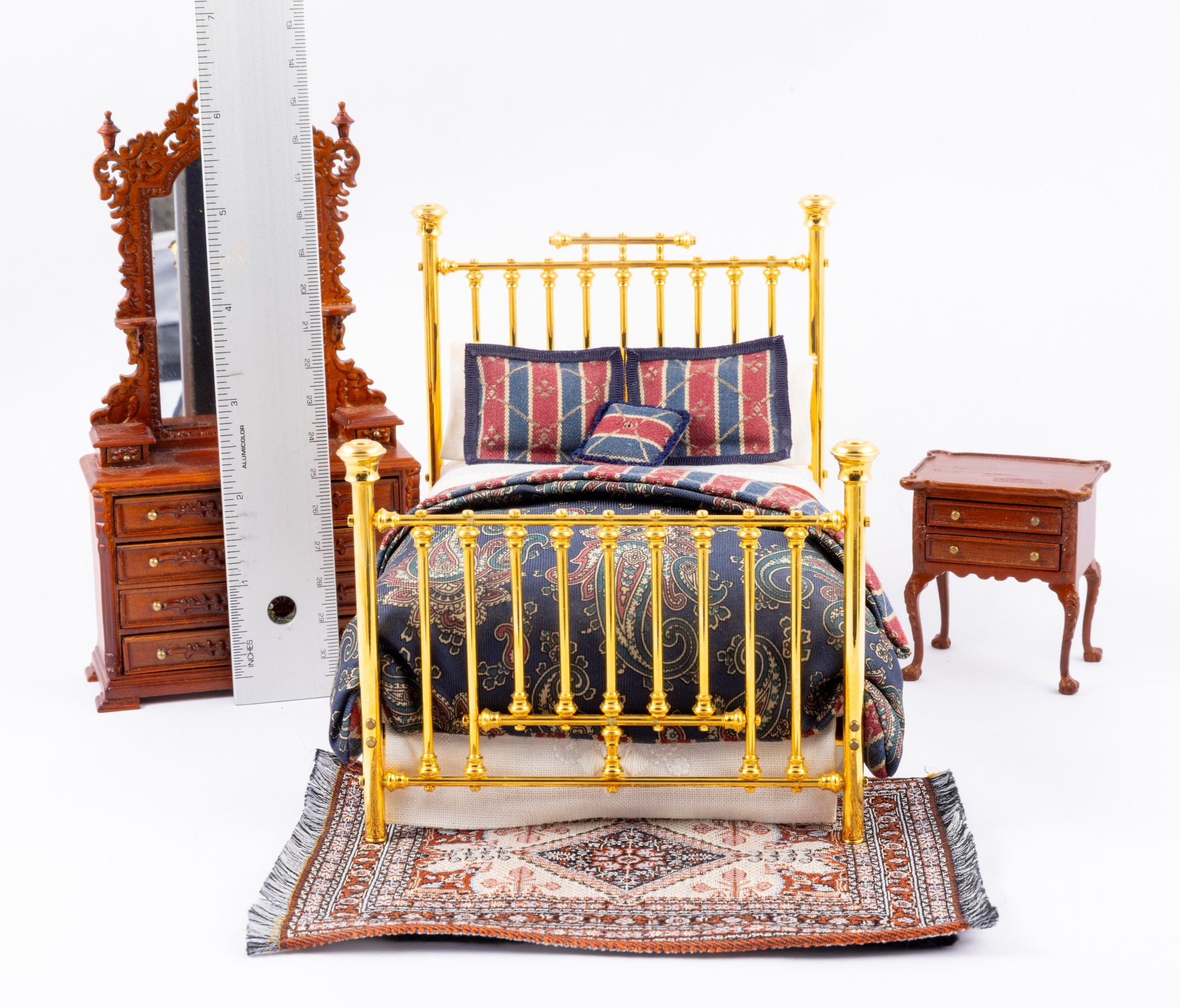 4 piece bedroom set. Set includes a brass bed with blue & red linens, a rug, a nightstand, and a dresser with a mirror.