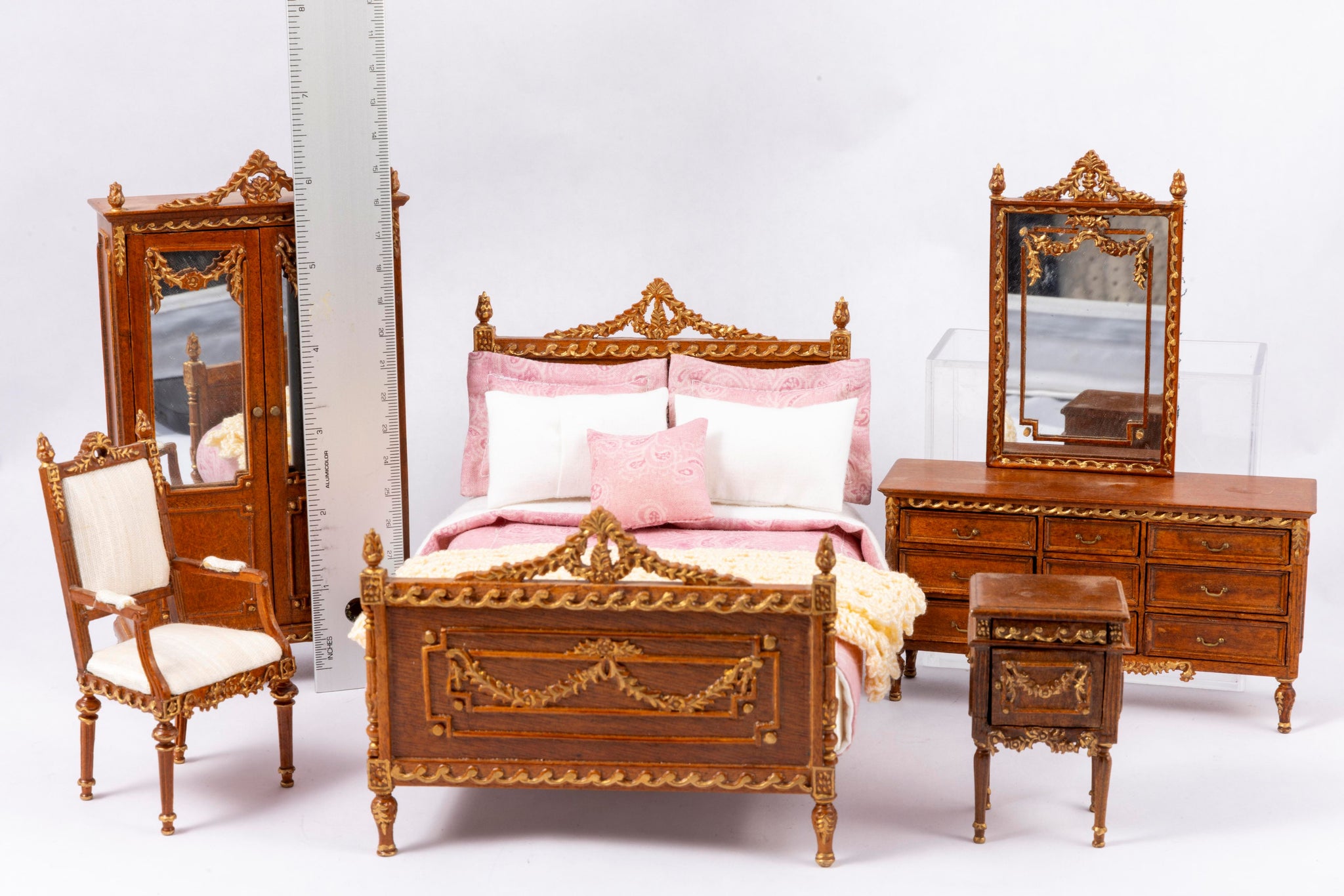 6 piece bedroom set with gold trim painted furniture. Set includes a double bed, wardrobe, chair, dresser, mirror, and nightstand.