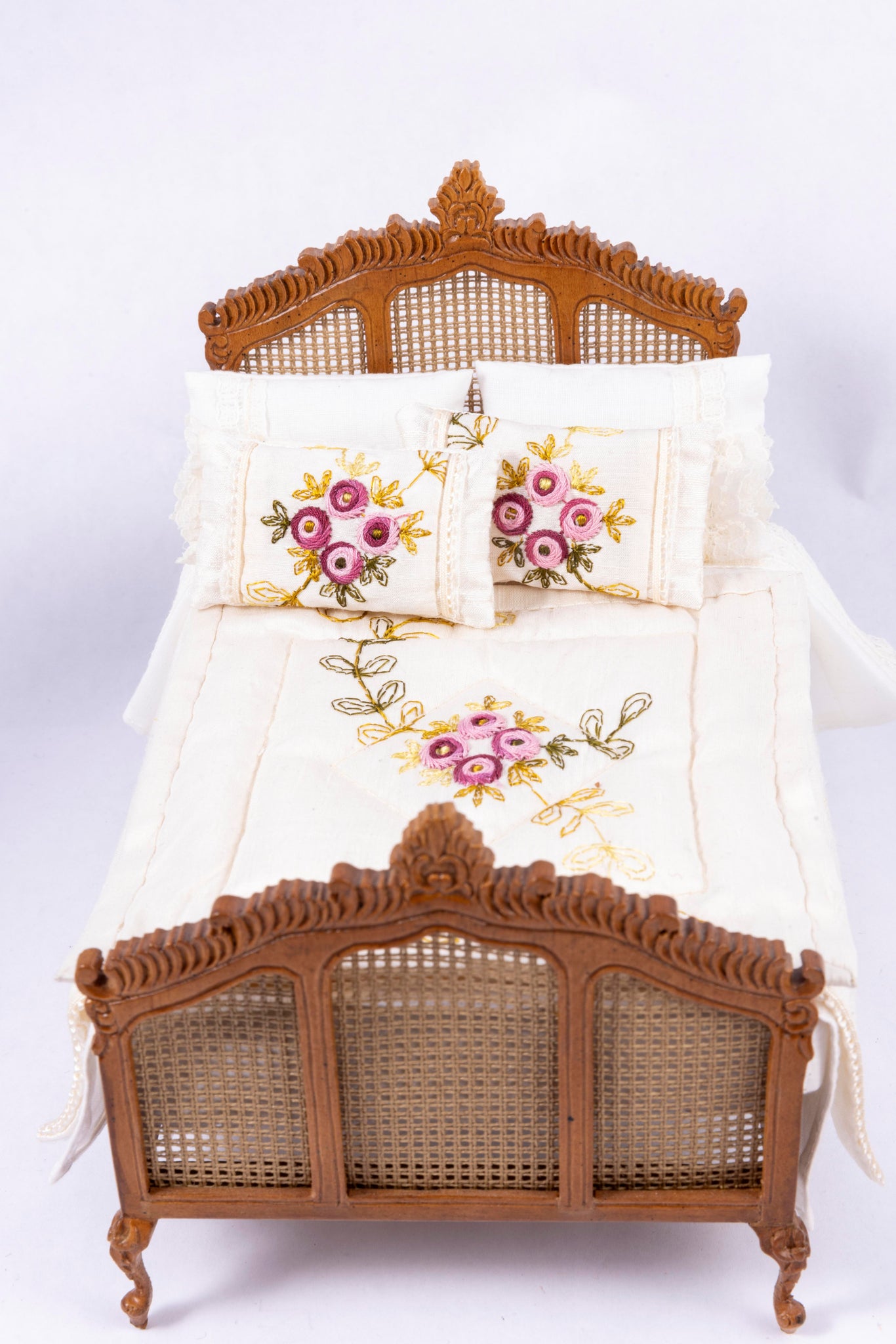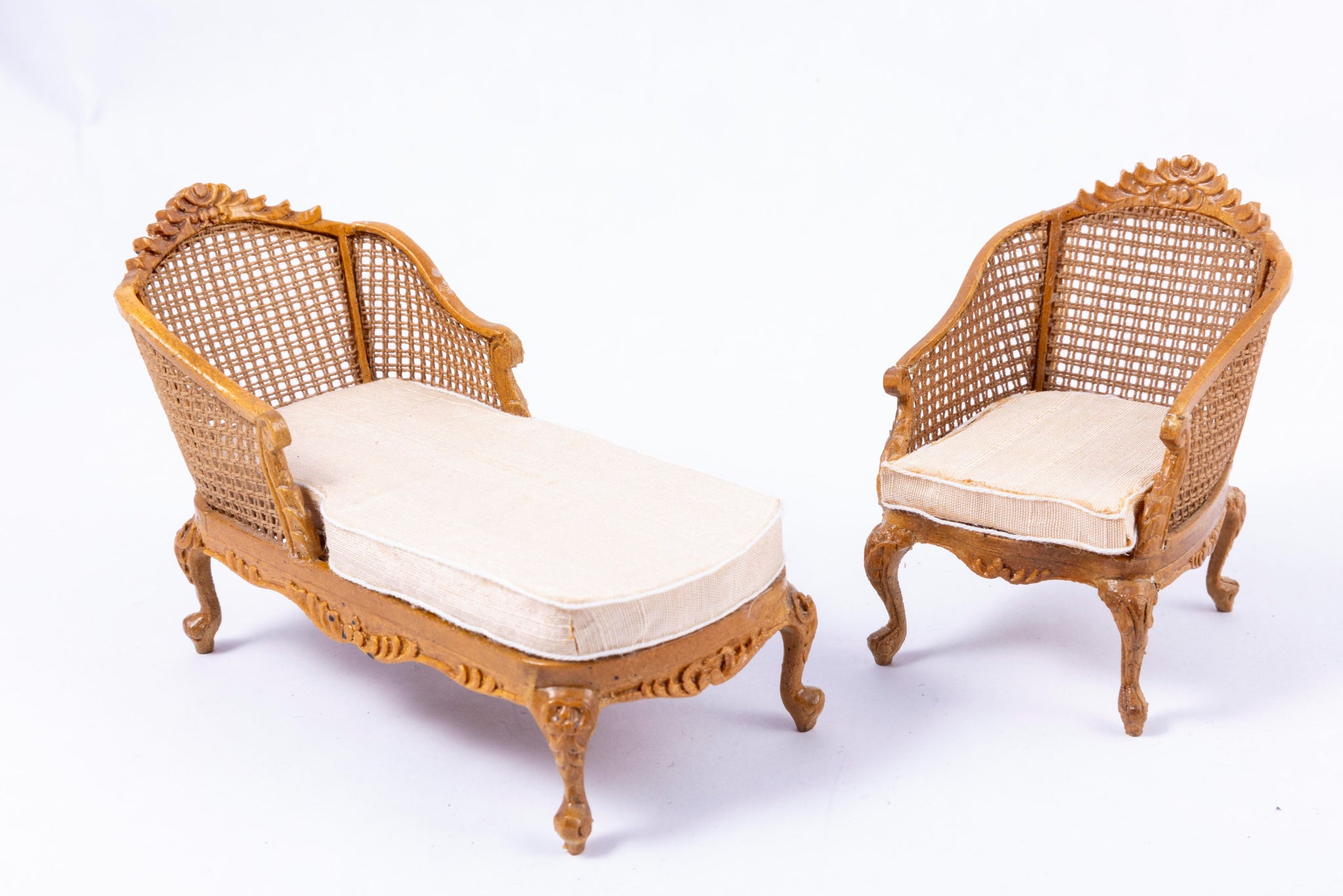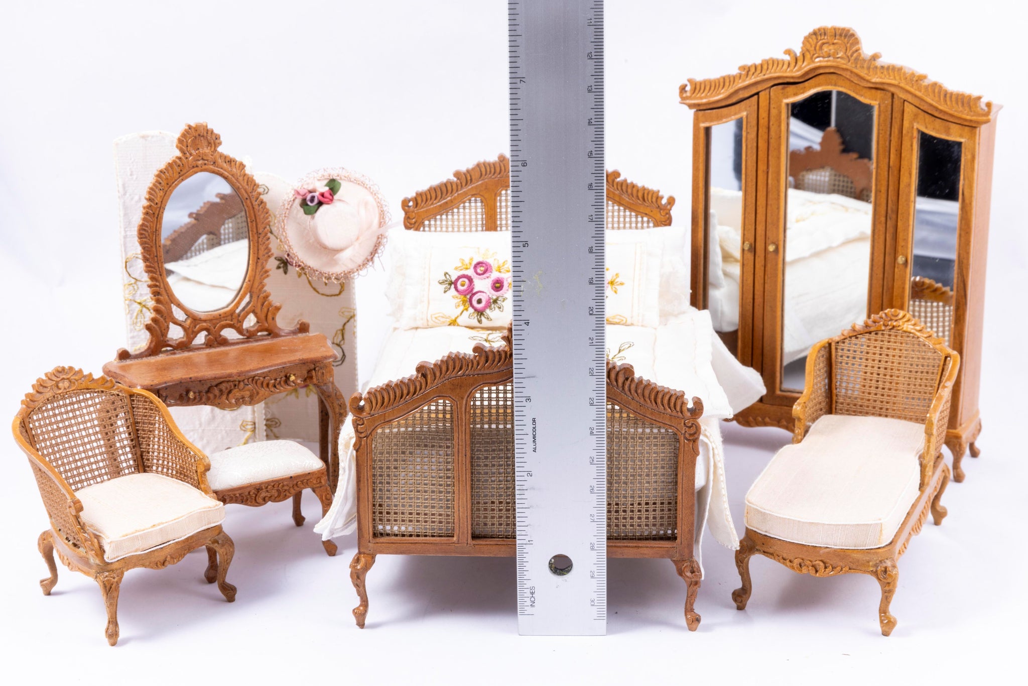 6 piece wicker and wooden bedroom set. Set includes bed, wardrobe, chaise lounge, vanity and stool, changing screen, and chair.