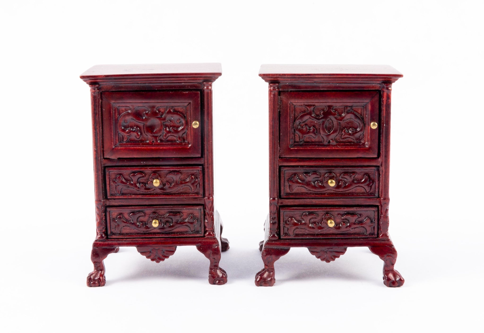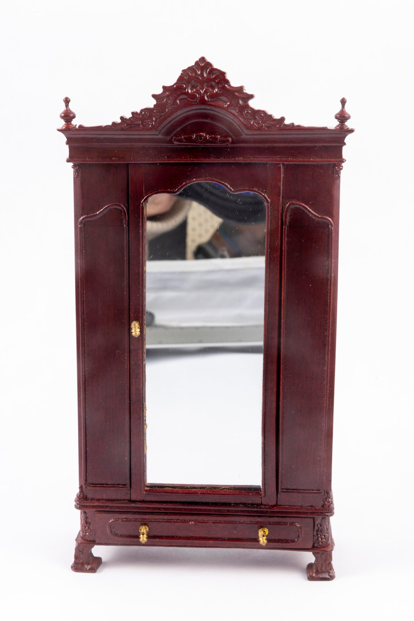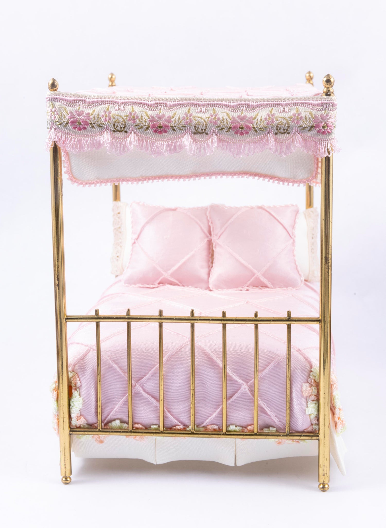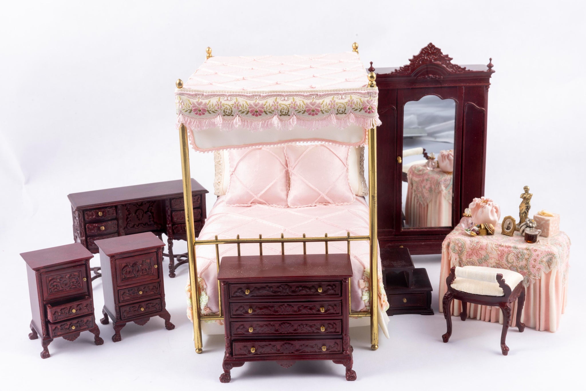 9 piece bedroom set. Set includes brass canopy bed, two nightstands, dresser, vanity desk, chair, wardrobe, decorated table, and foot stool. The wooden furniture is mahogany.