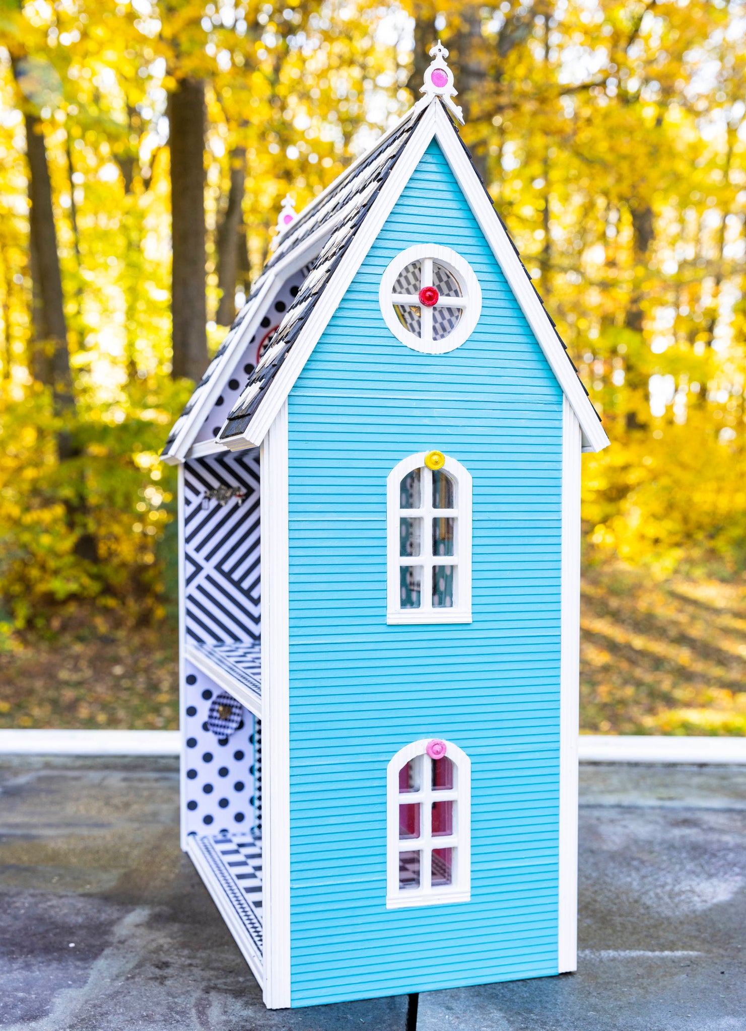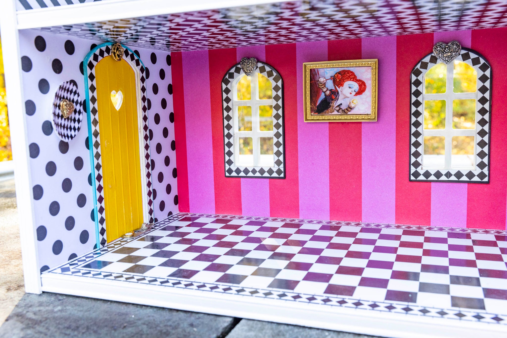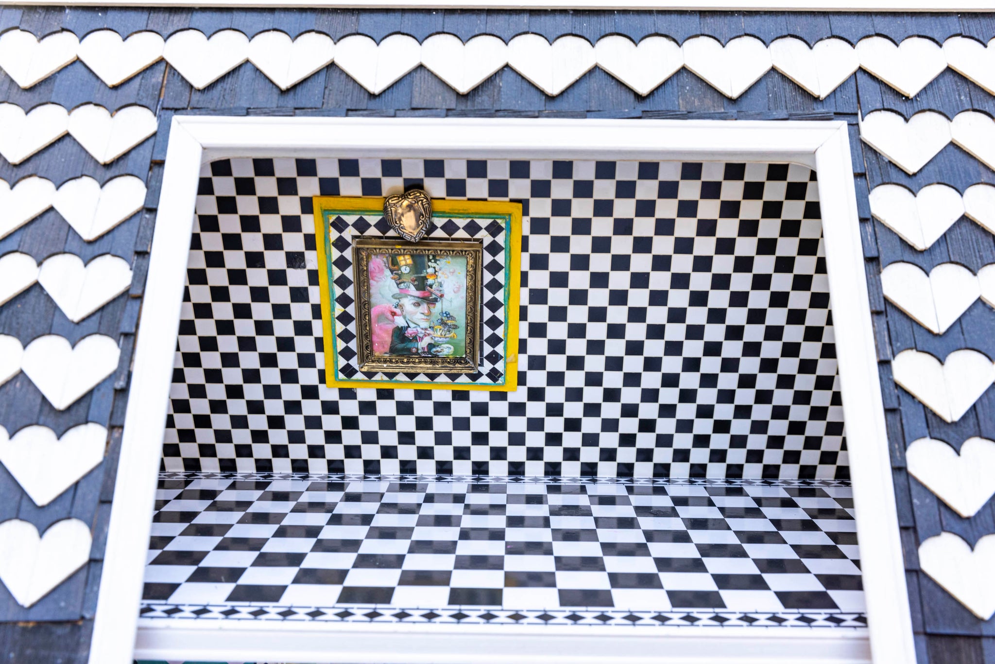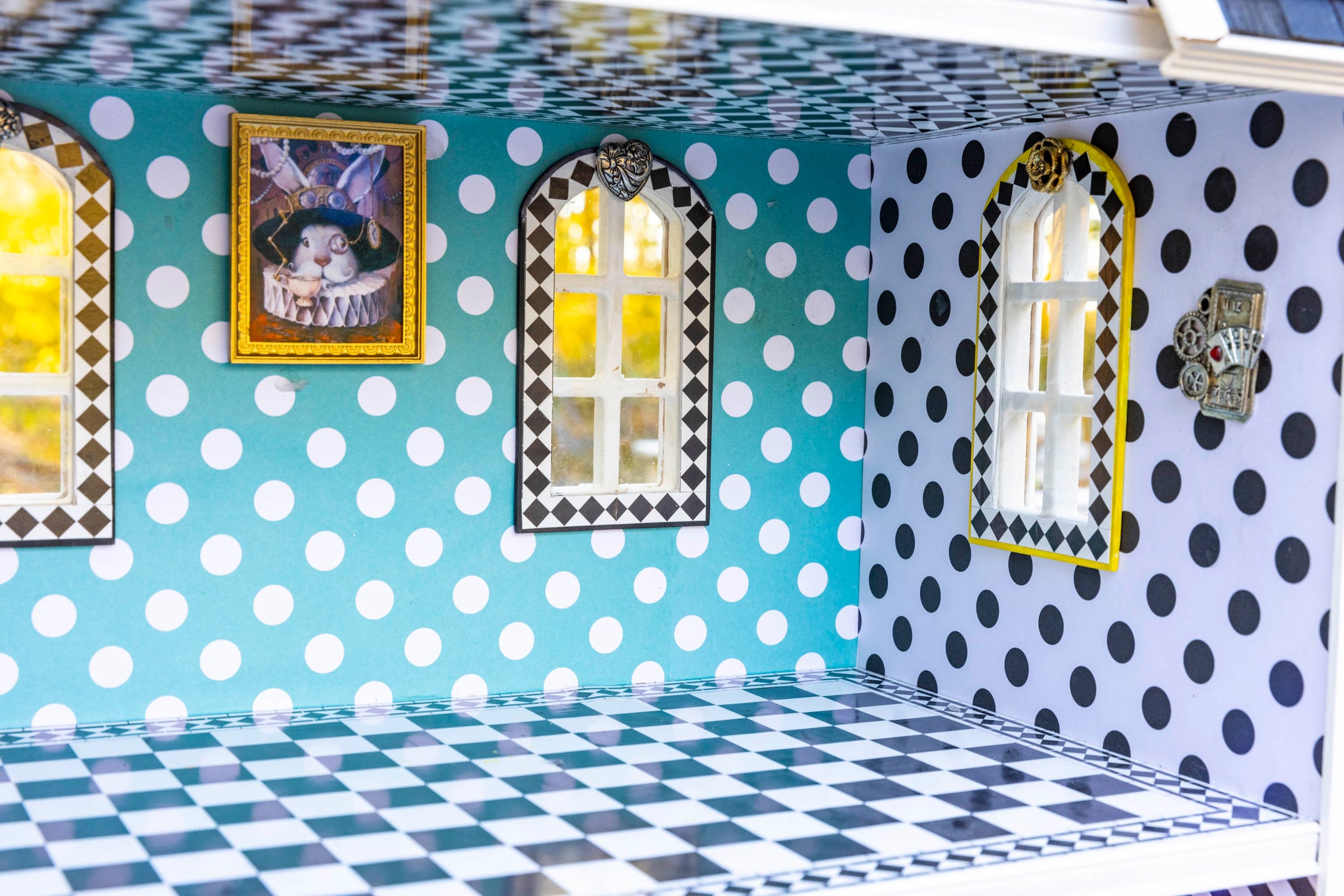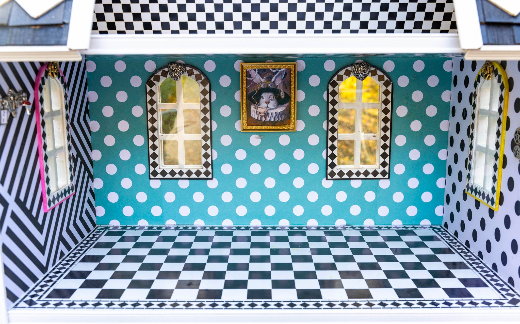 Some one of a kind pieces in this Alice in Wonderland dollhouse that are from England. Blue three story house with hearts on the back. Black and white tile flooring and wallpaper decorate the inside. Queen of Hearts picture on the wall downstairs floor. Table and chairs, clock, piano and bench, wonky clock, painted fireplace, handmade and painted chairs with the rabbit.