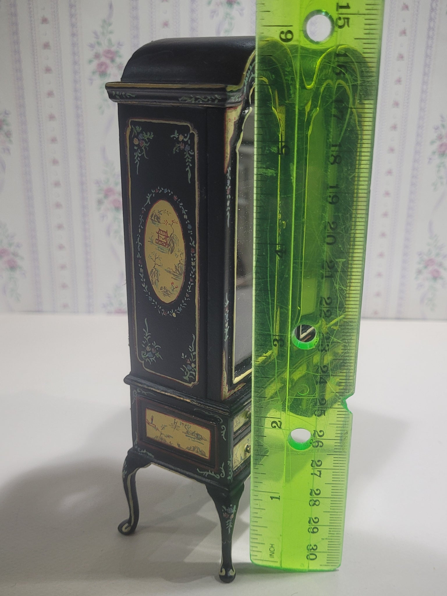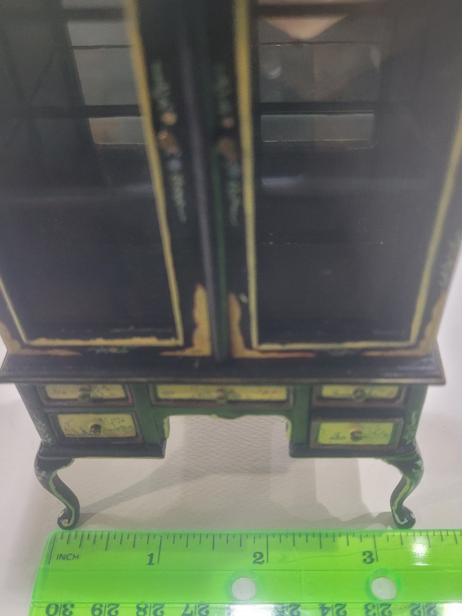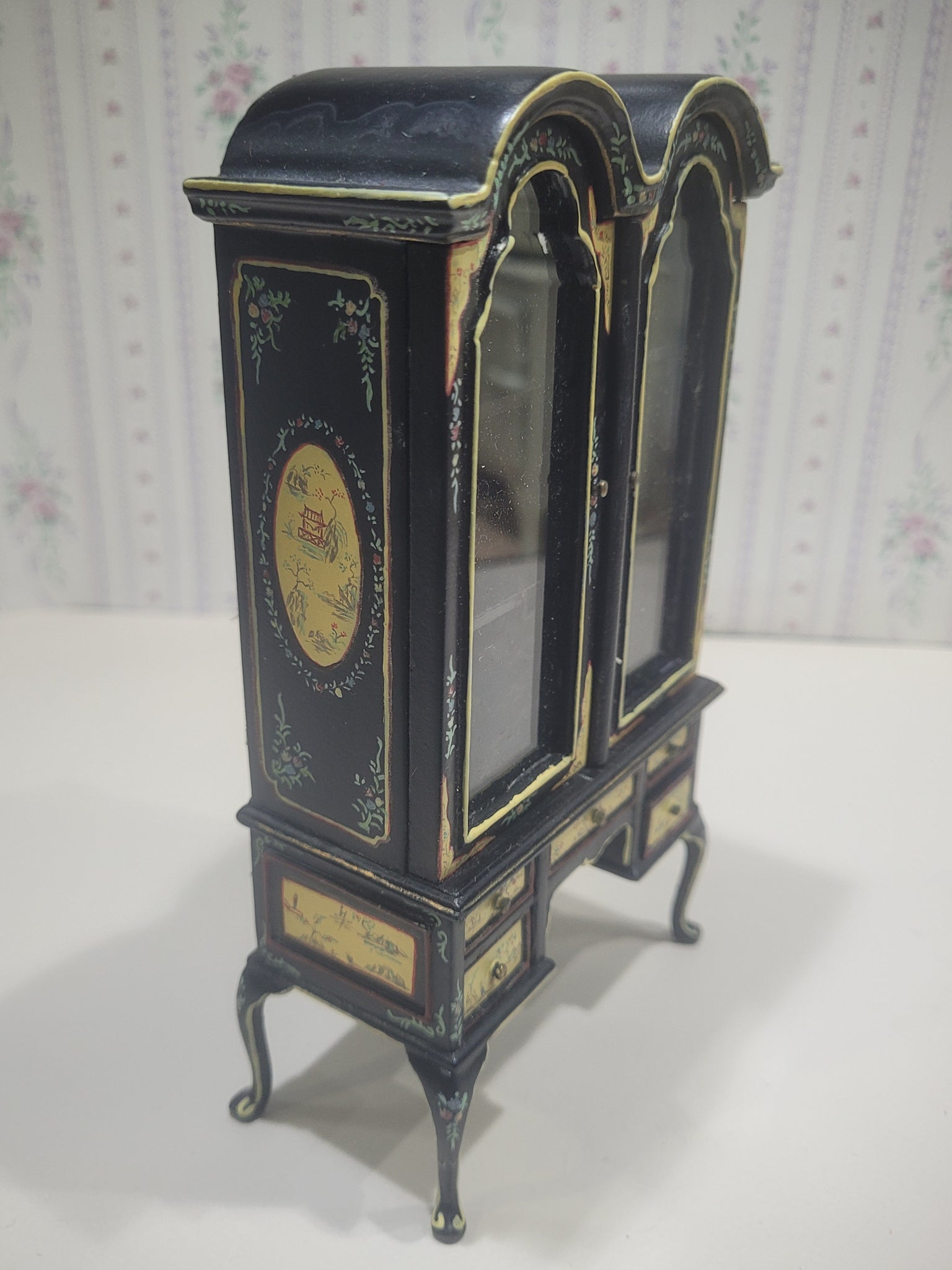 This is a Black Hutch with Shelves inside. Exterior has a variety of detailed floral and decorative paintings