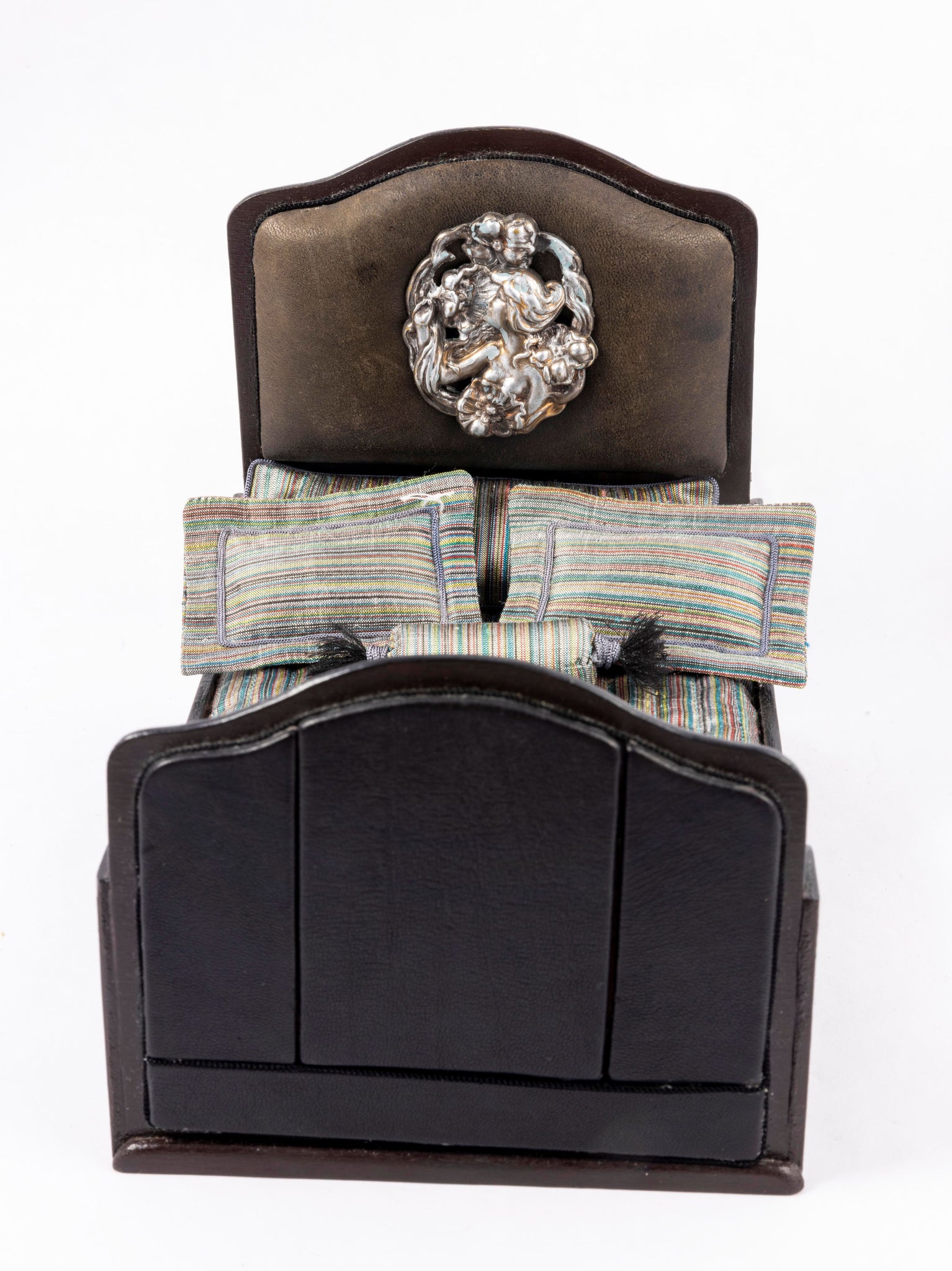 Handmade faux leather bed with striped linens. The bed is black.