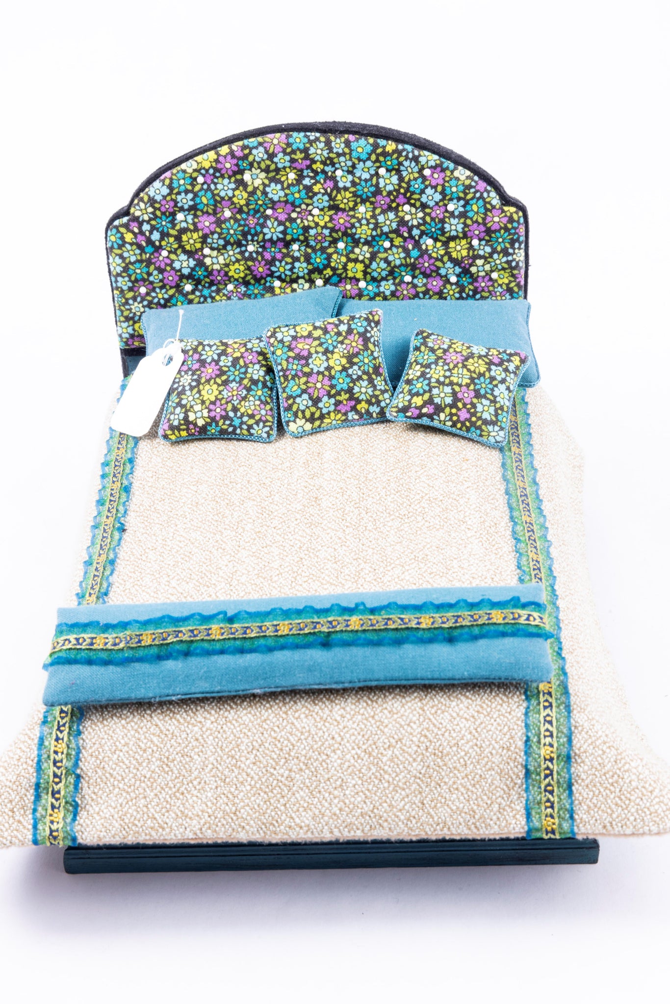 Double bed with floral blue and green decor. Comes with three throw pillows.