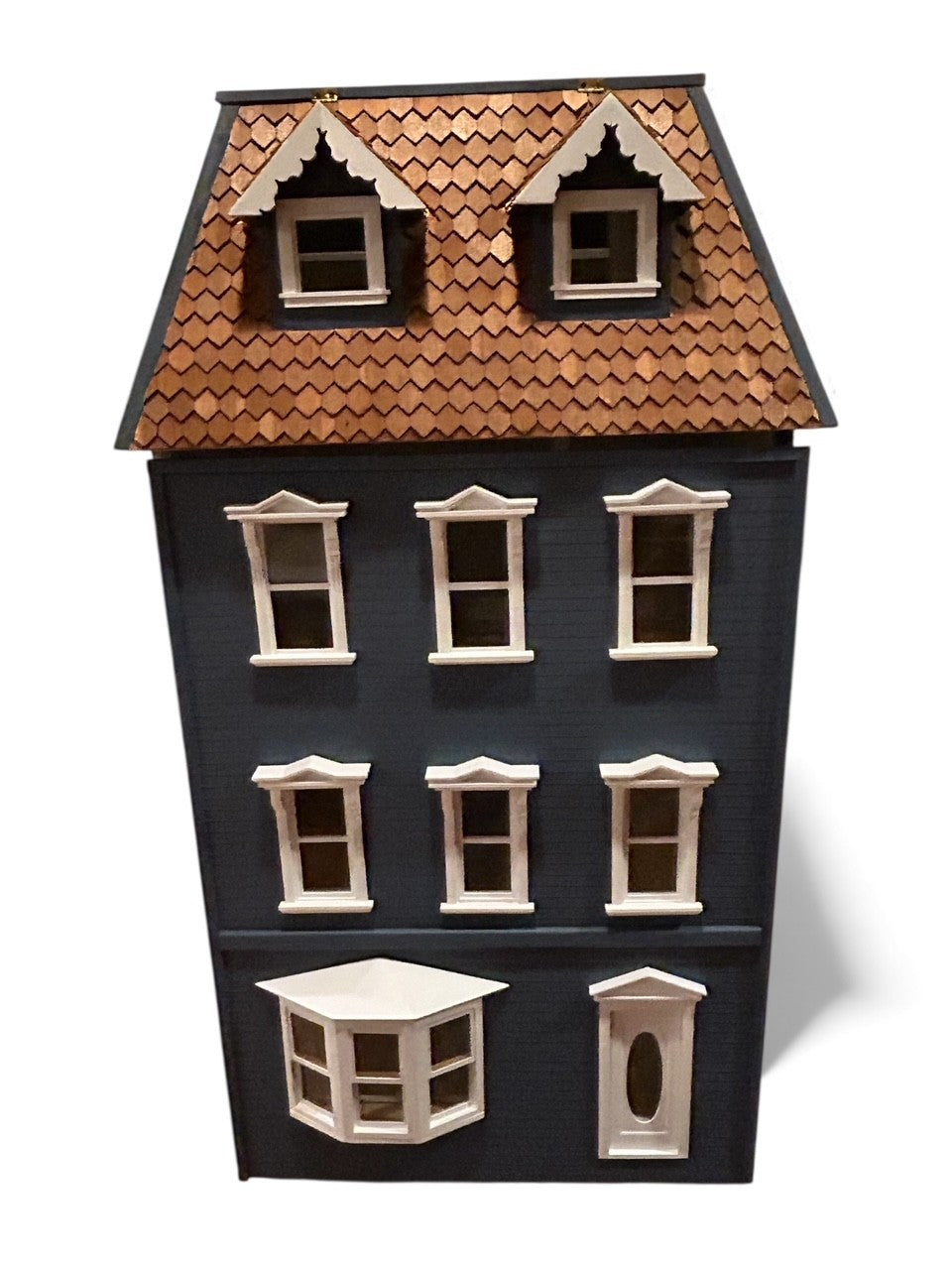 This front opening townhouse has rooms on 4 floors. It has been painted in blue, and the roof is fully shingled. There are 2 dormer windows in the attic.