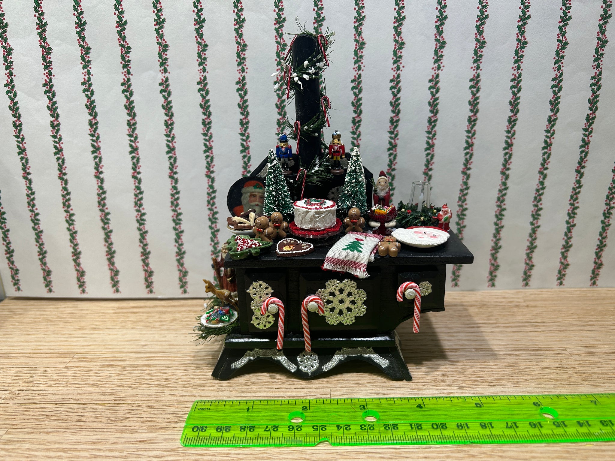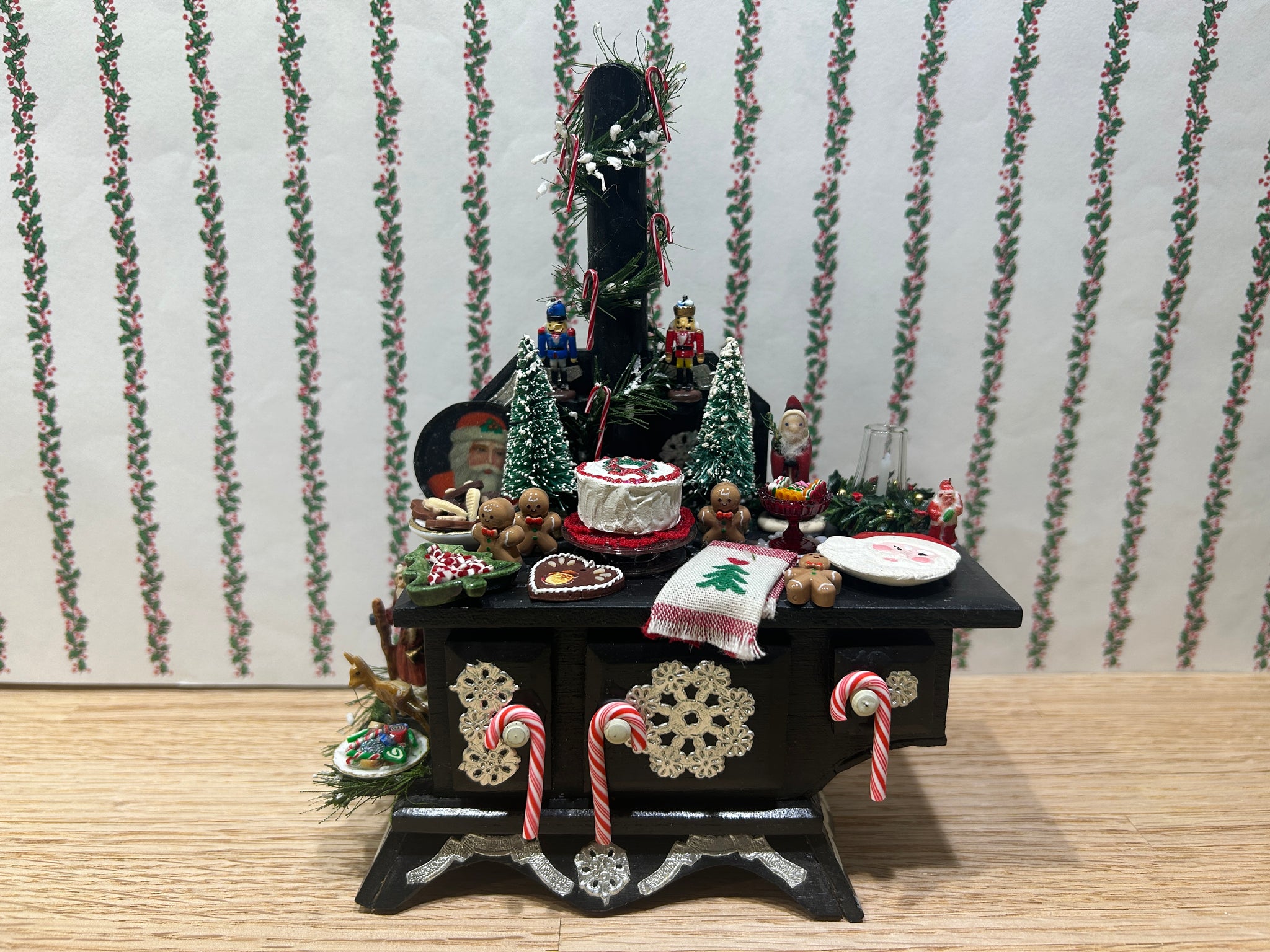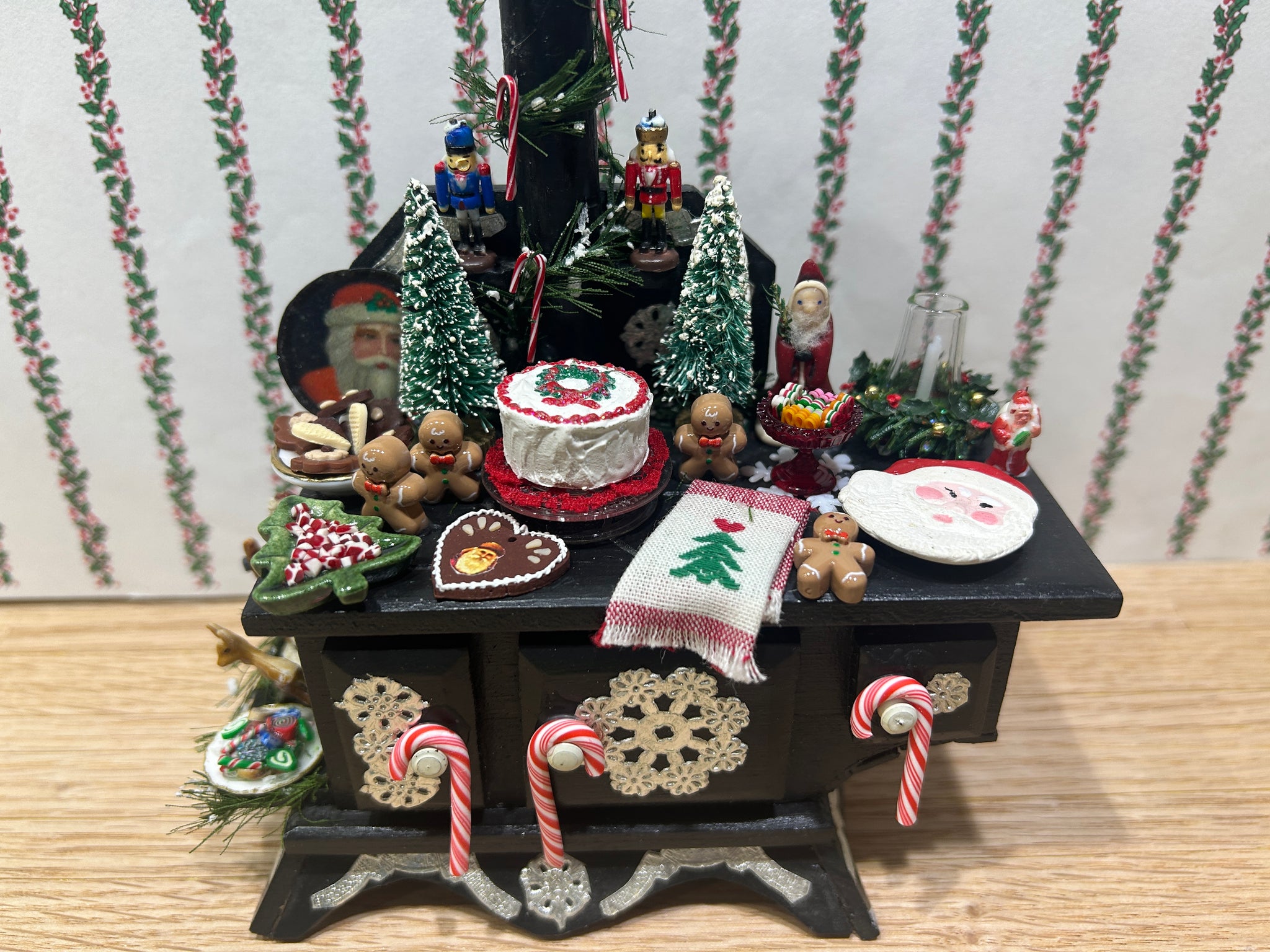Lovely decorated stove for Christmas. Includes candy canes, a cake, gingerbread men, nutcrackers, etc.