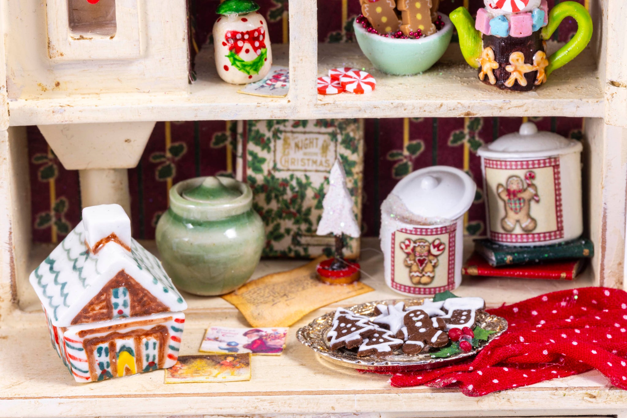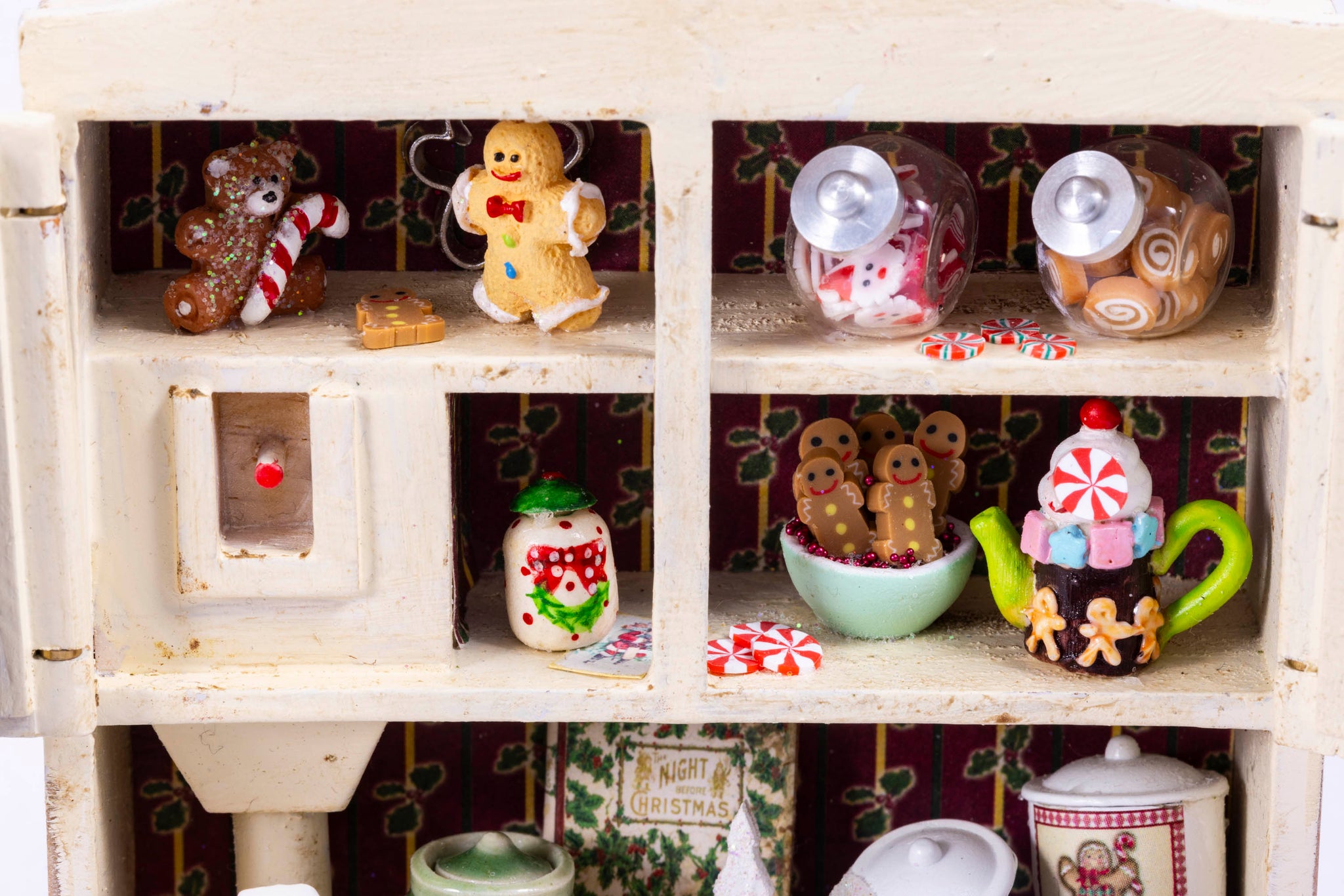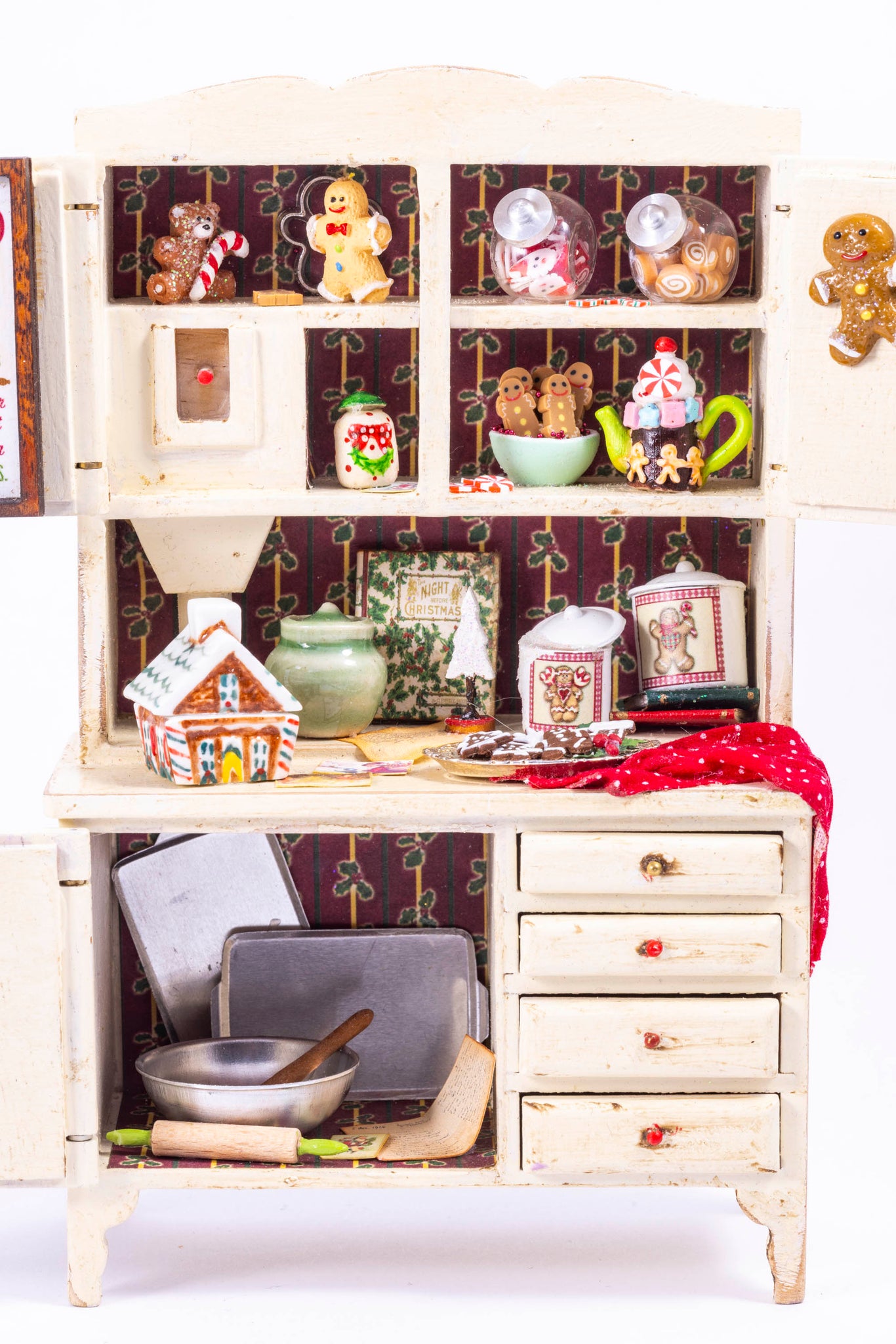 Christmas decorated kitchen Hoosier cabinet. So well done by Laura Crain. Mixing bowl, ginger bread, and lots of accessories! 1:12 scale