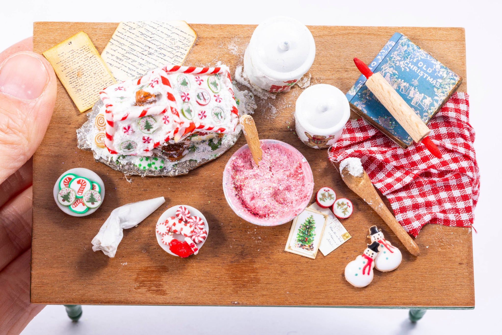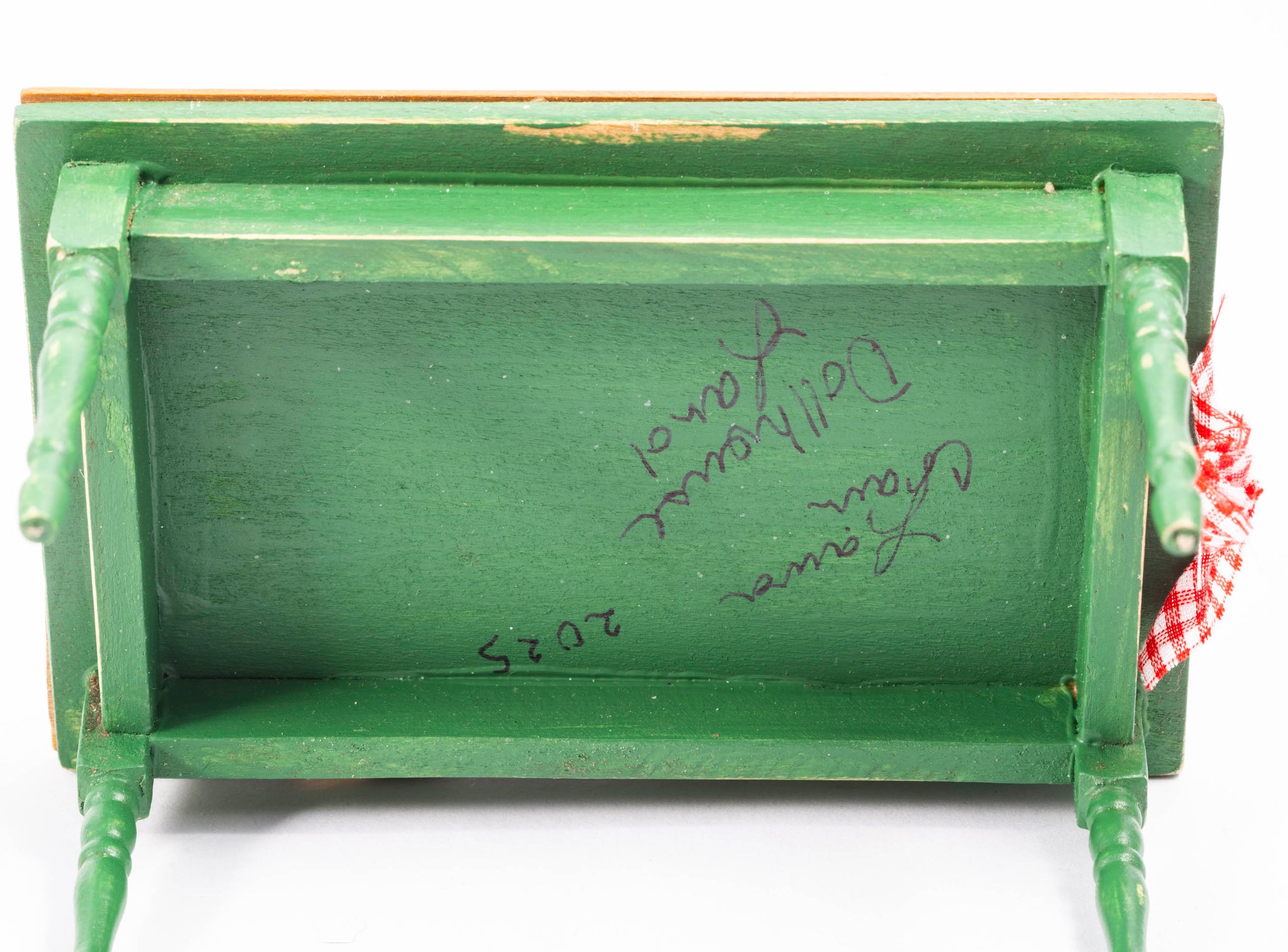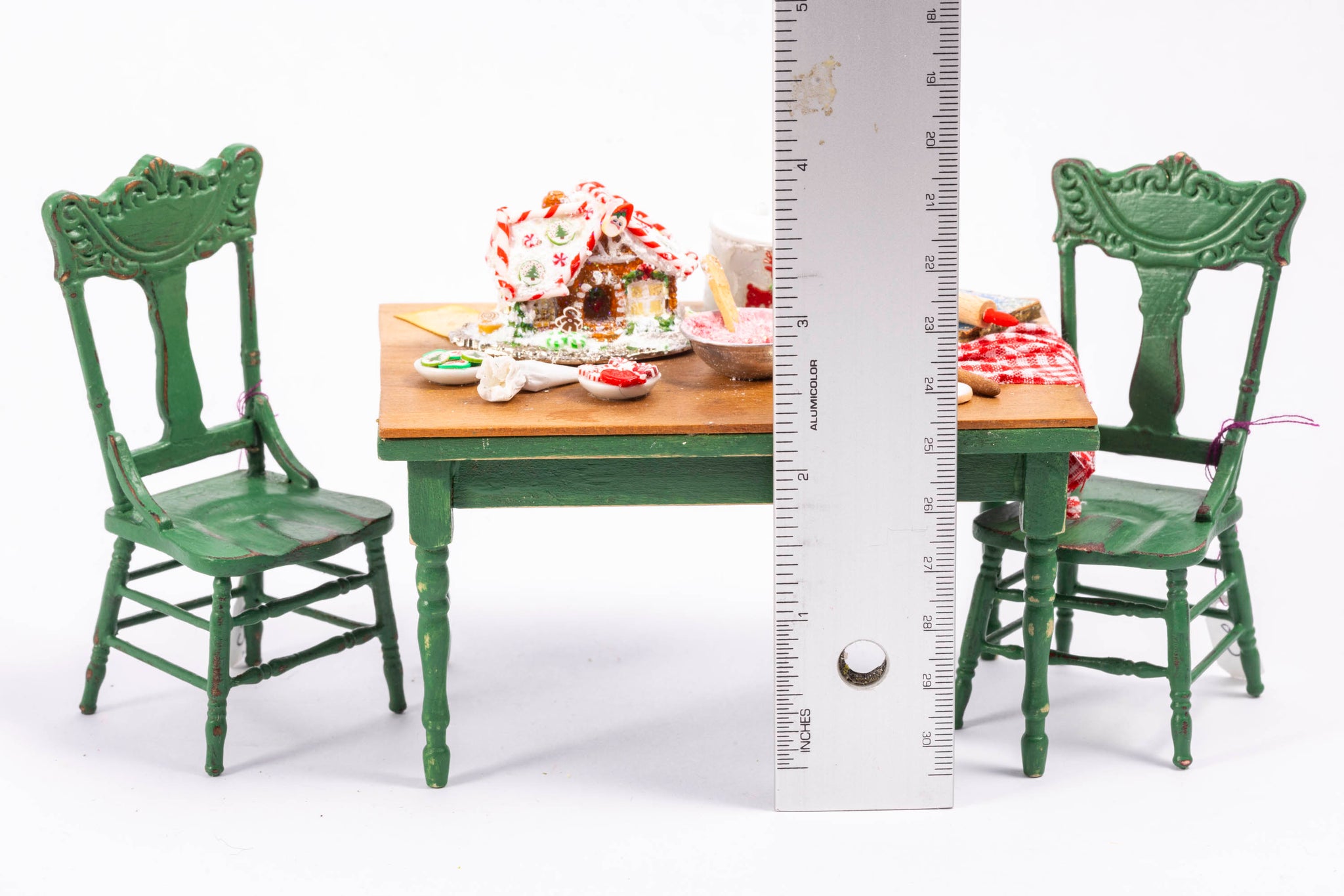 Christmas Decorated Table & Chairs by Laura Crain. Painted green chairs, wooden. Decorated gingerbread table. 1:12 scale.