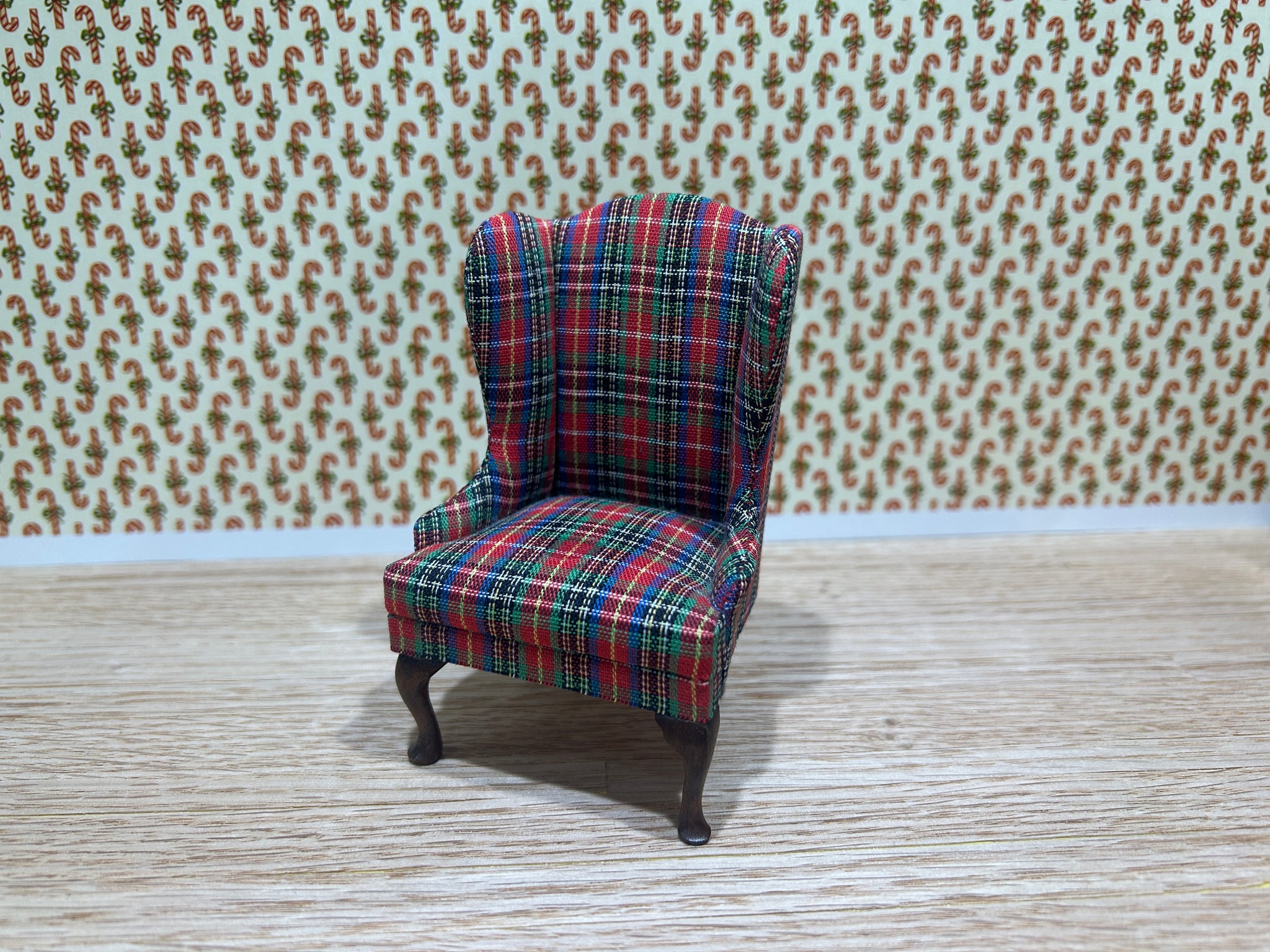 Christmas plaid wingback chair by D. Anne Ruff. Please note - there is dried glue on the seat than can easily be covered by a doll, blanket, etc.