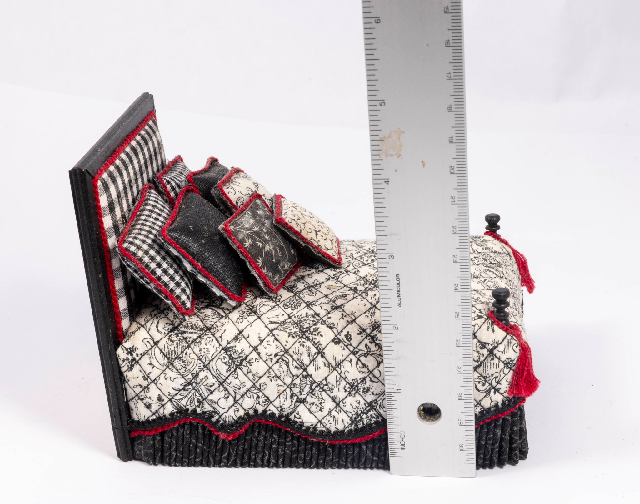 Decorated Black/White & Red Bed. Padded headboard, red tassles. Skirted around the bed, well made.