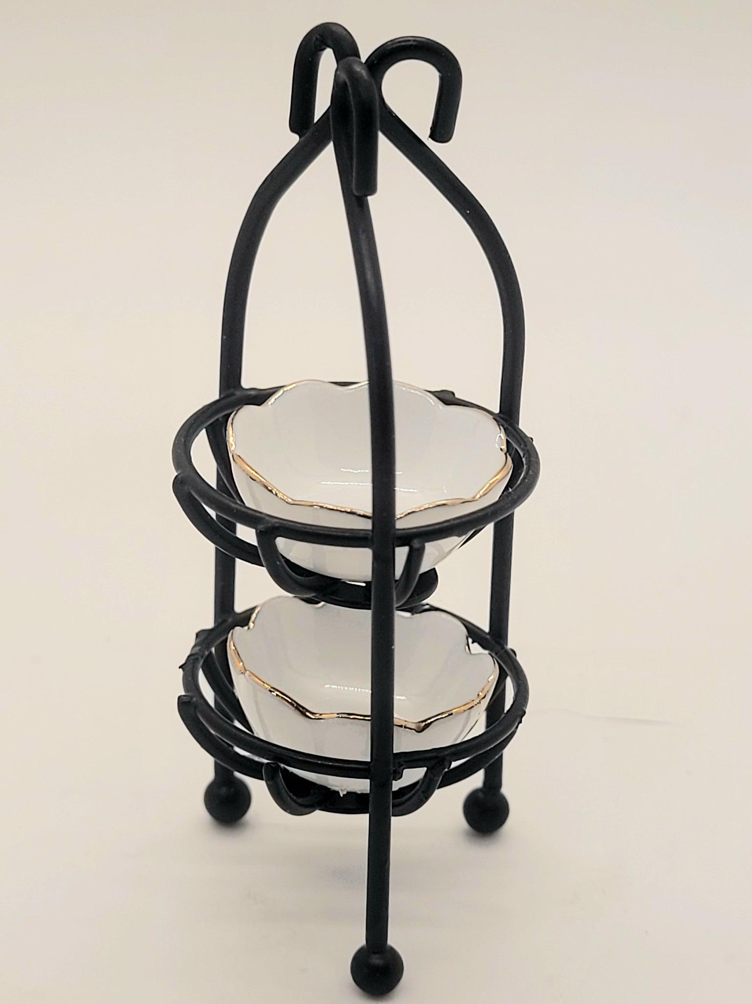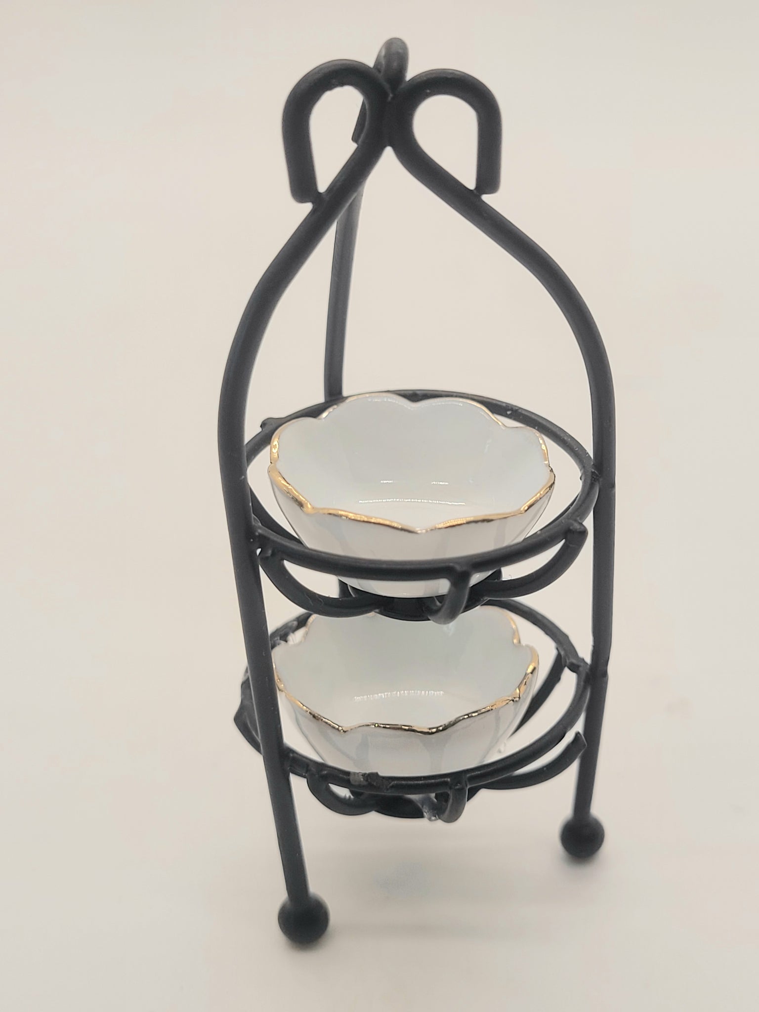 This is a 2-Tier Bowl Holder with 2 Gold-Trimmed Bowls