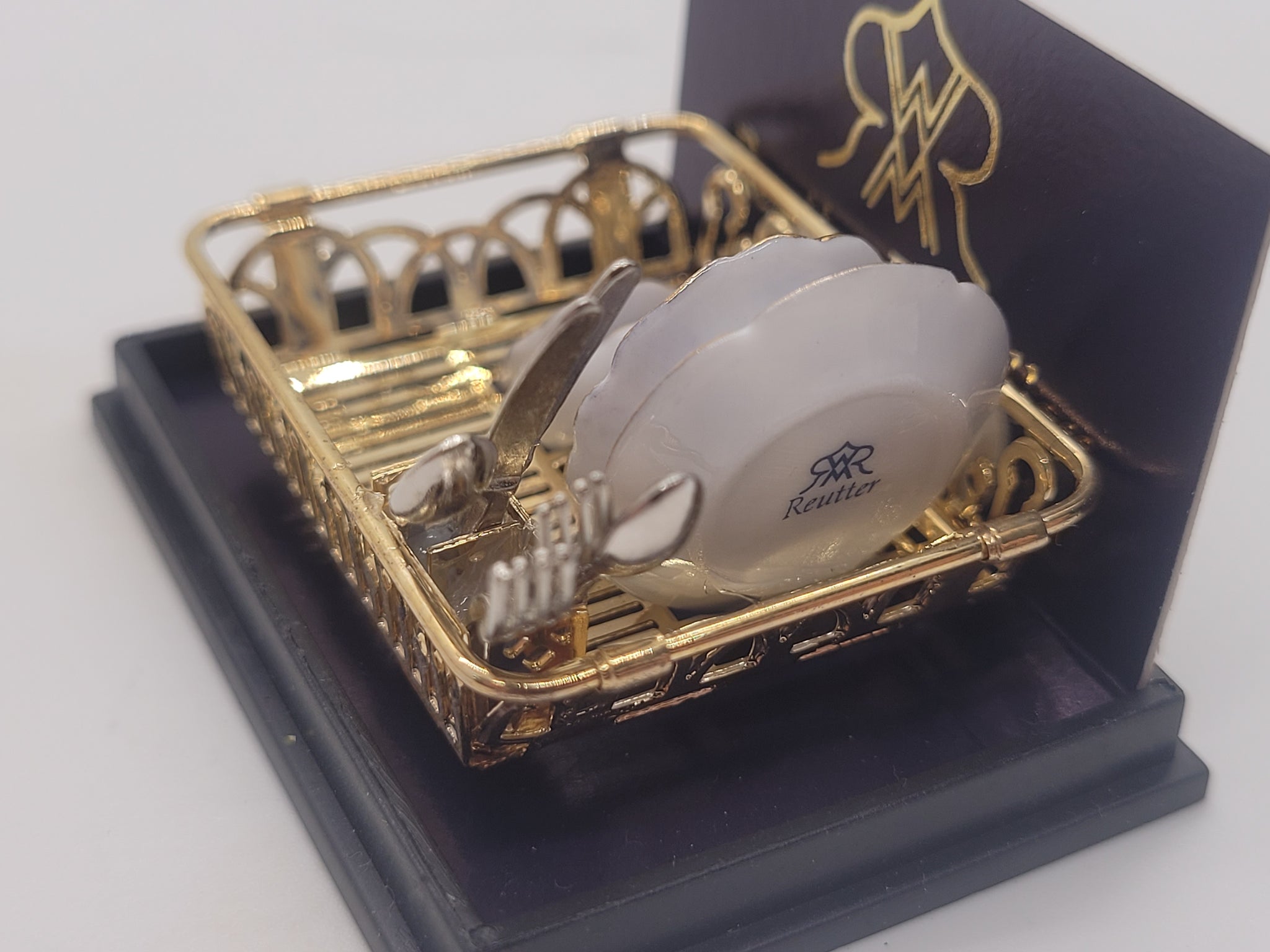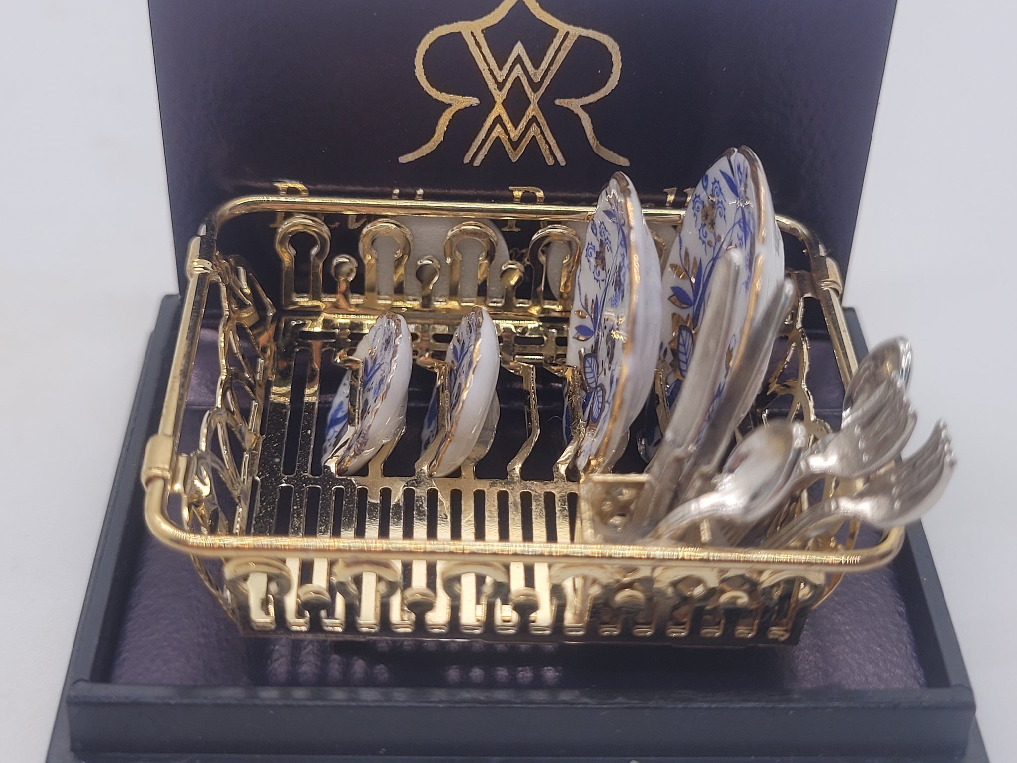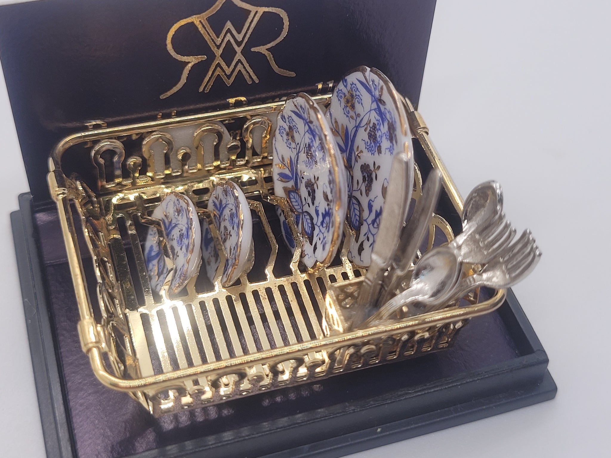 Blue Floral China Plate in Golden Drying Rack with Silverware