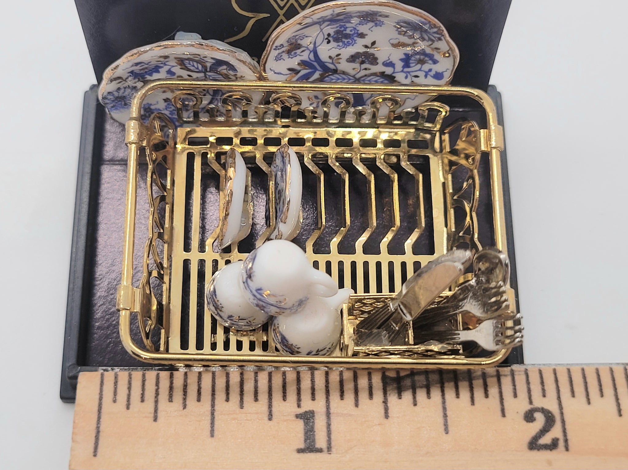 Blue Onion Dishware and Silverware in Golden Drying Rack