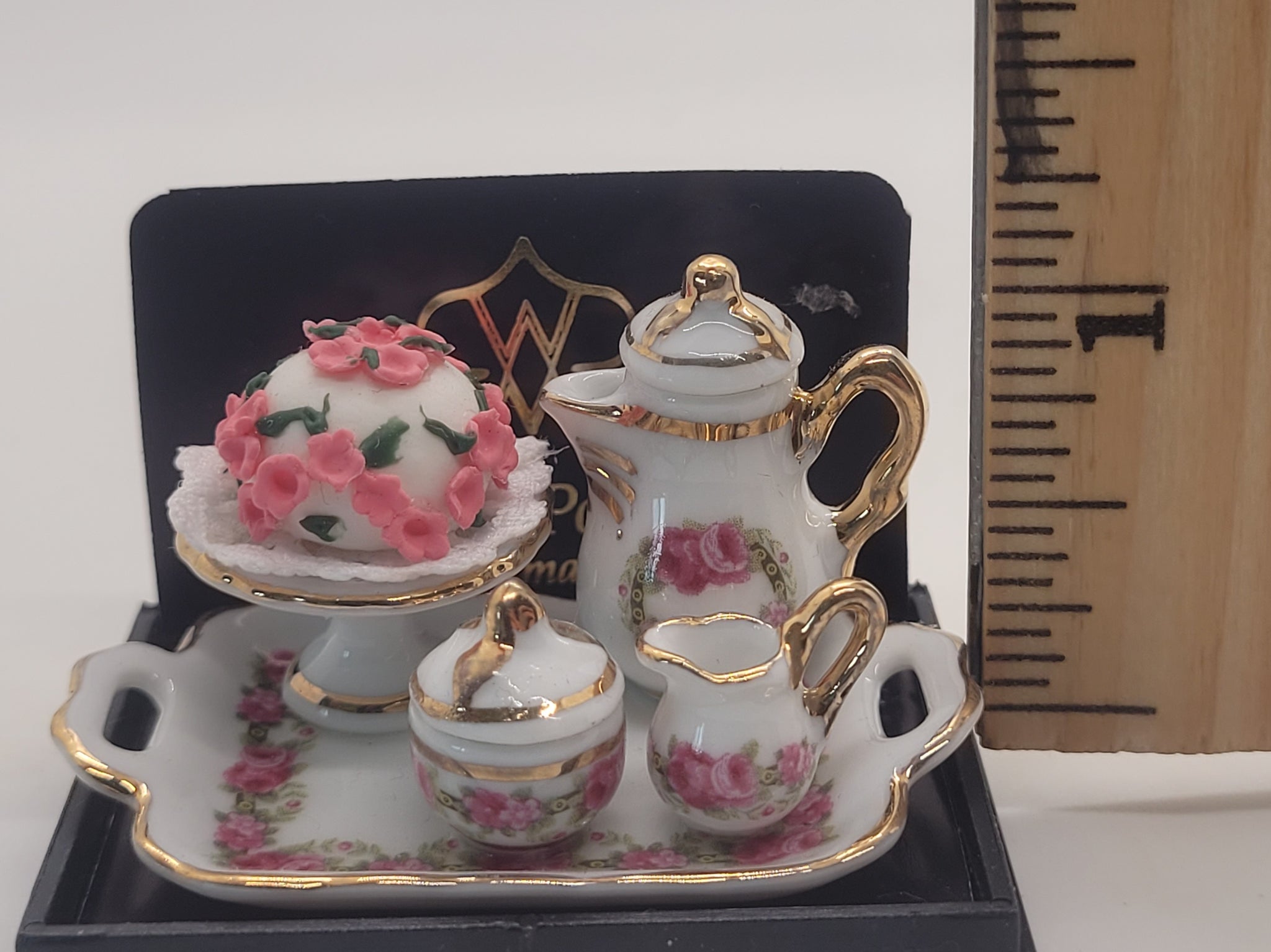 Rose Cake on Platter with Rose-Themed, Gold-Trimmed Tea Set
