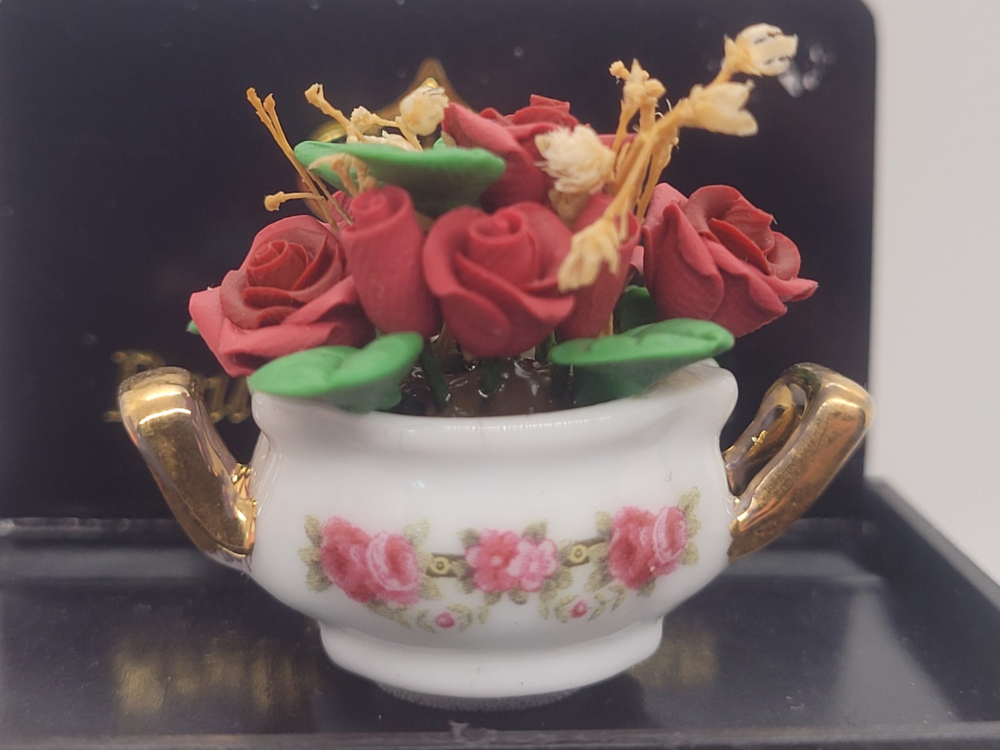 Roses and Wheat in Rose Pot with Golden Handles.