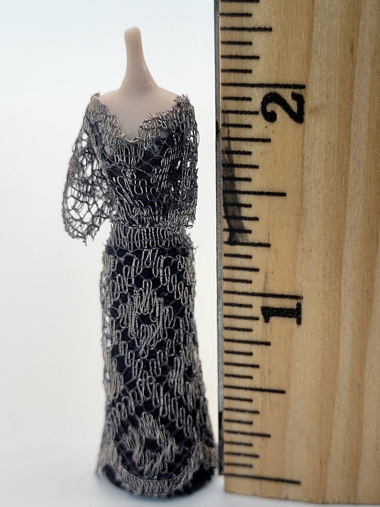 Handmade Black and Silver Dress on Porcelain Mannequin.