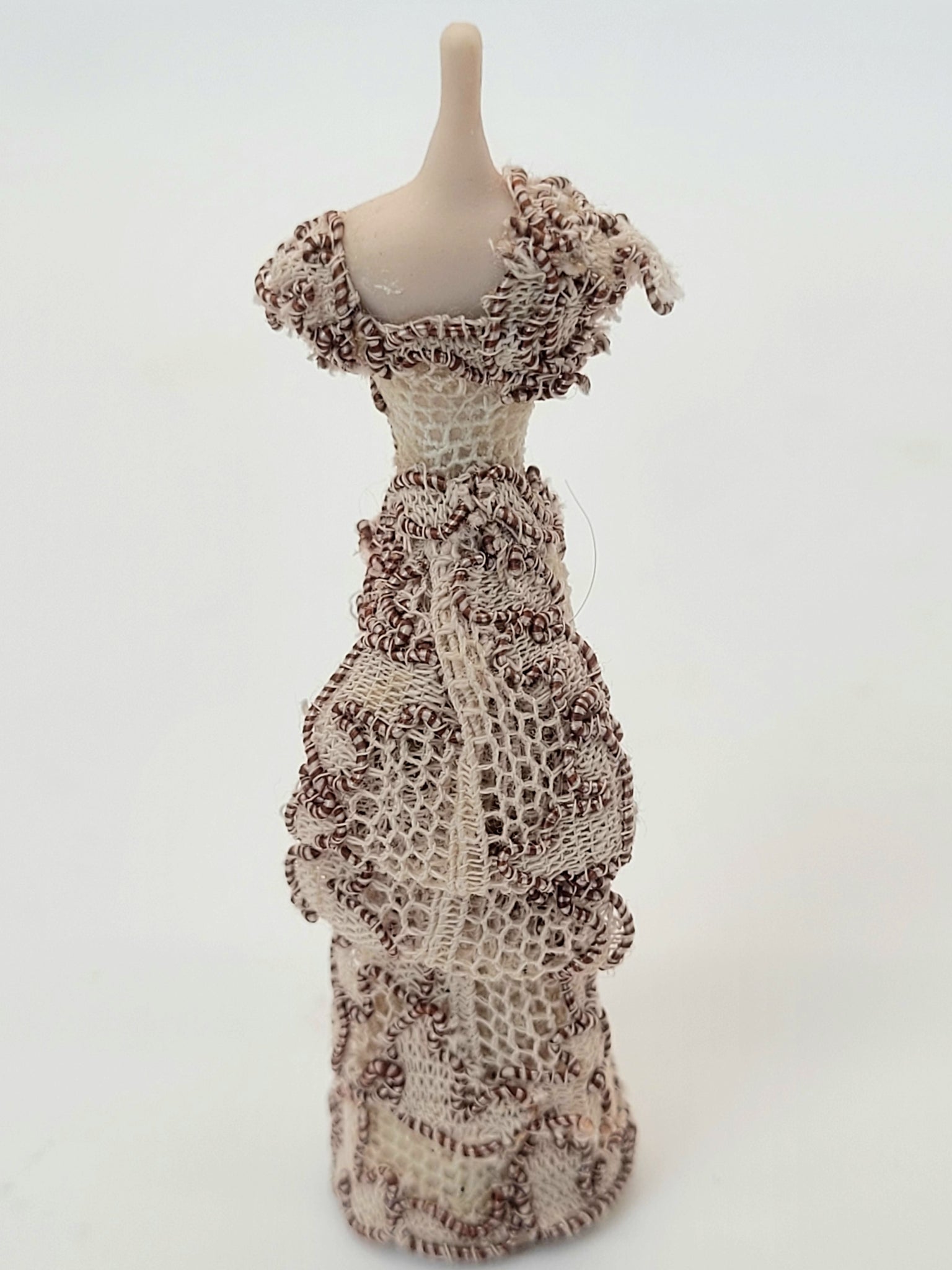 Handmade Lace Brown and Nude Dress on Porcelain Mannequin.