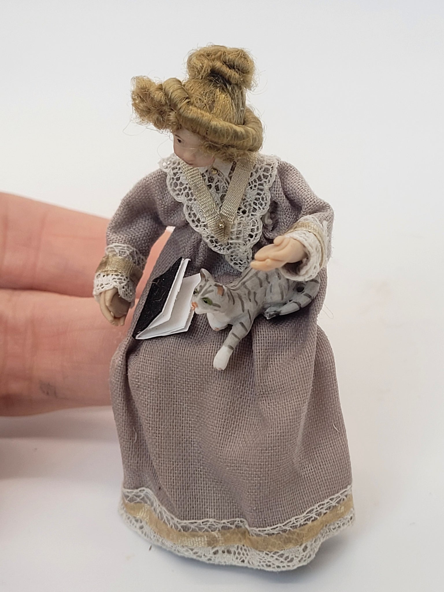 This is a Handmade Victorian Woman Doll Sitting with a Book and a Cat.