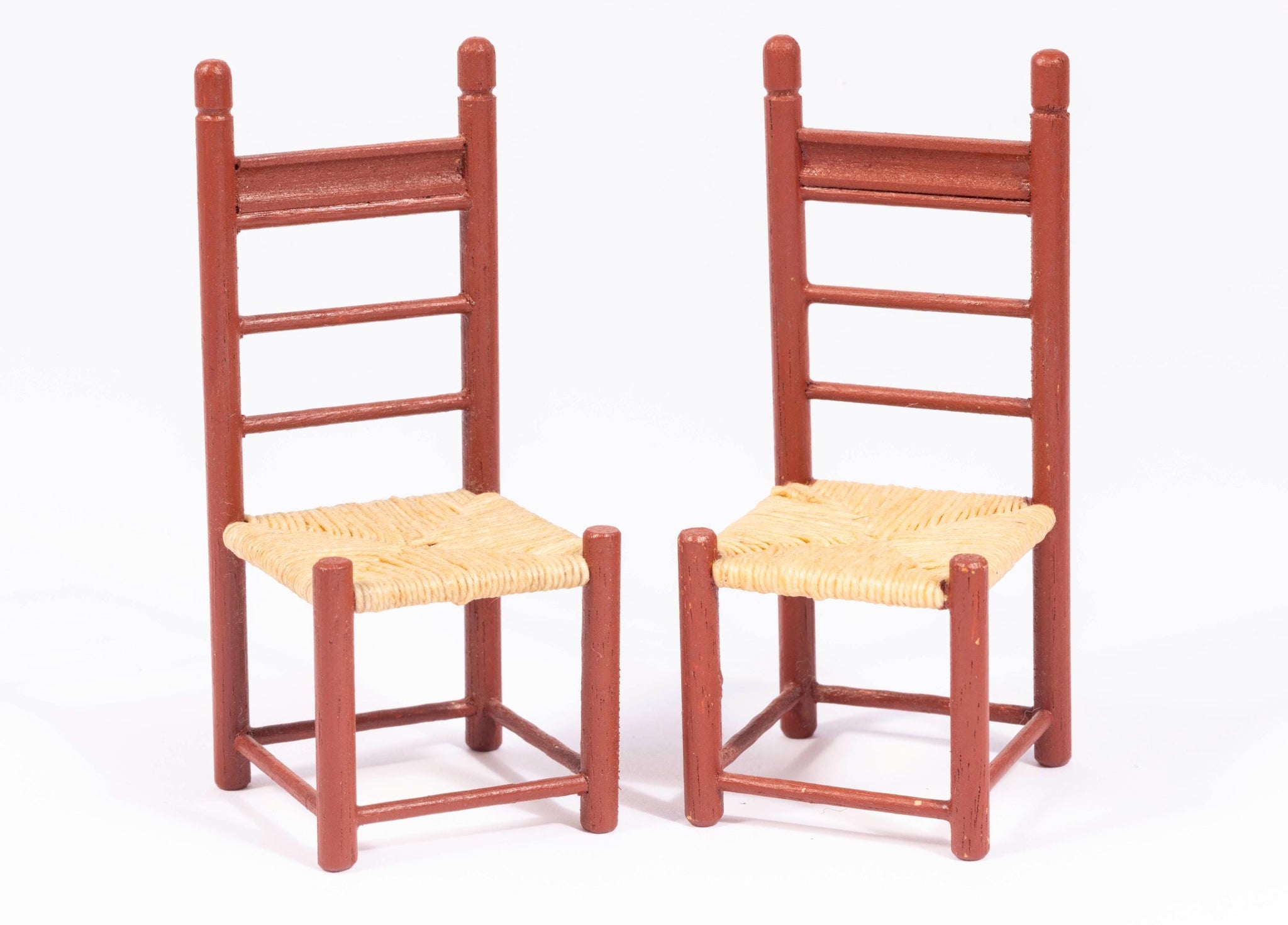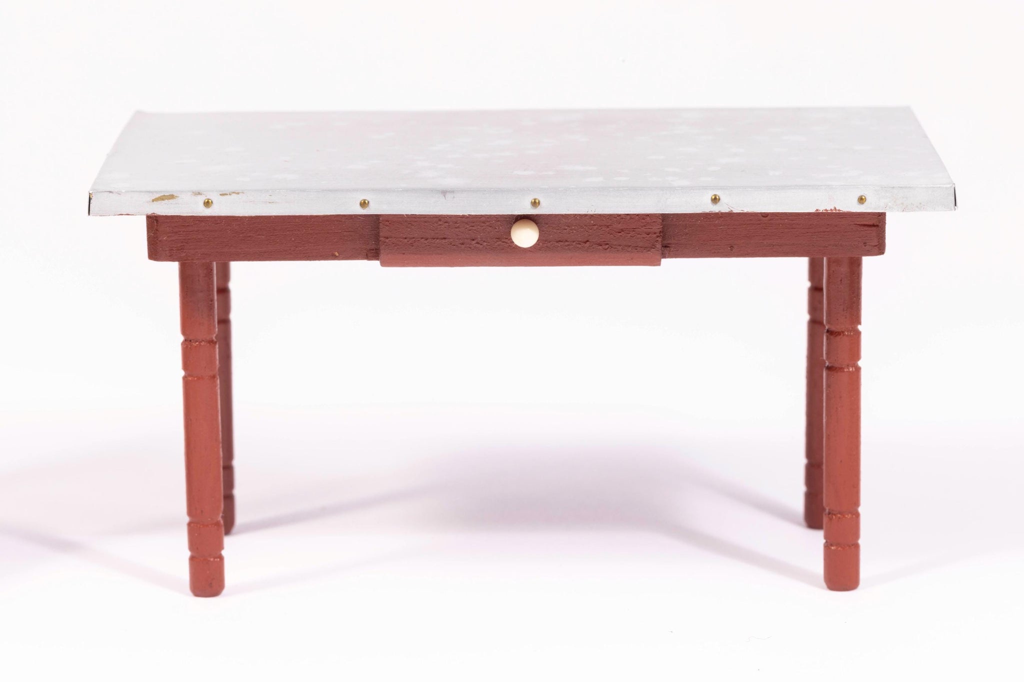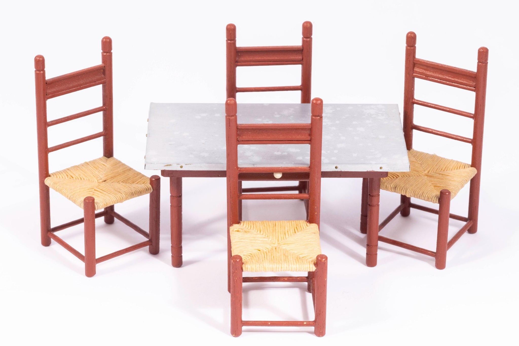 This is a wonderful hand painted red table and chairs set. There's four ladder back rush seat chairs, and a matching table with a metal top. Drawer opens. A terrific set.