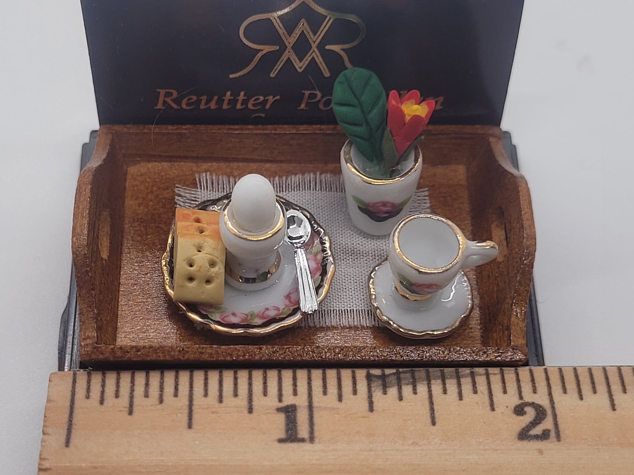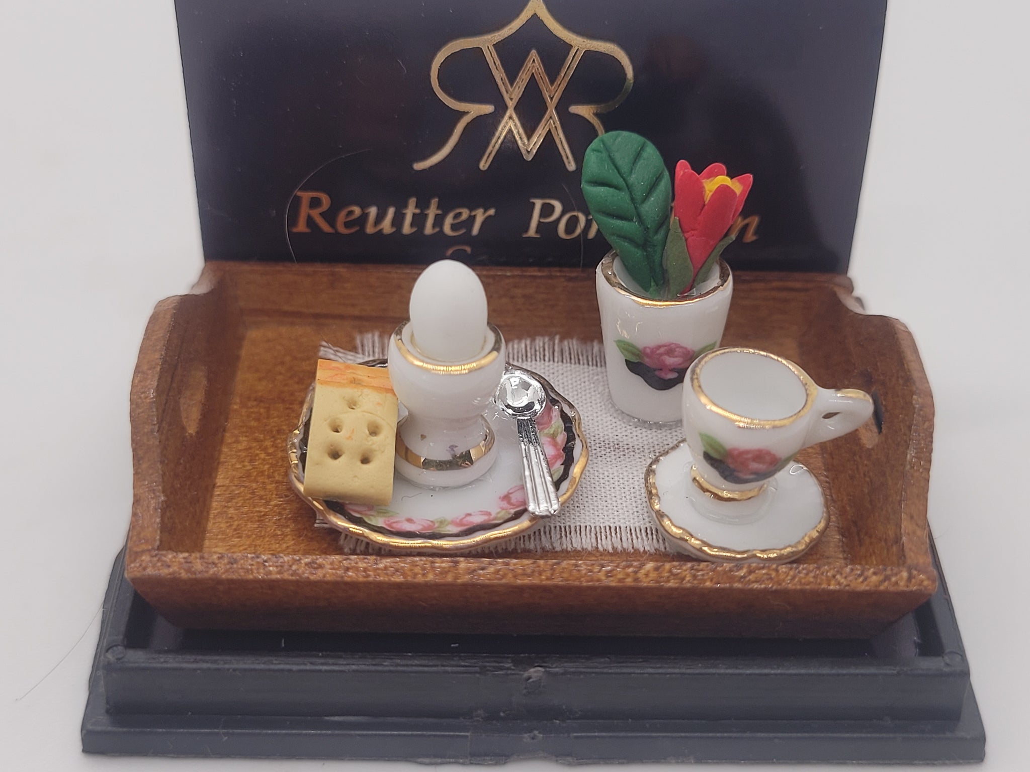 This is a Breakfast Tray featuring crackers, egg in an egg cup, and Teacup with Some Flowers. China displays a 'Black Rose'.