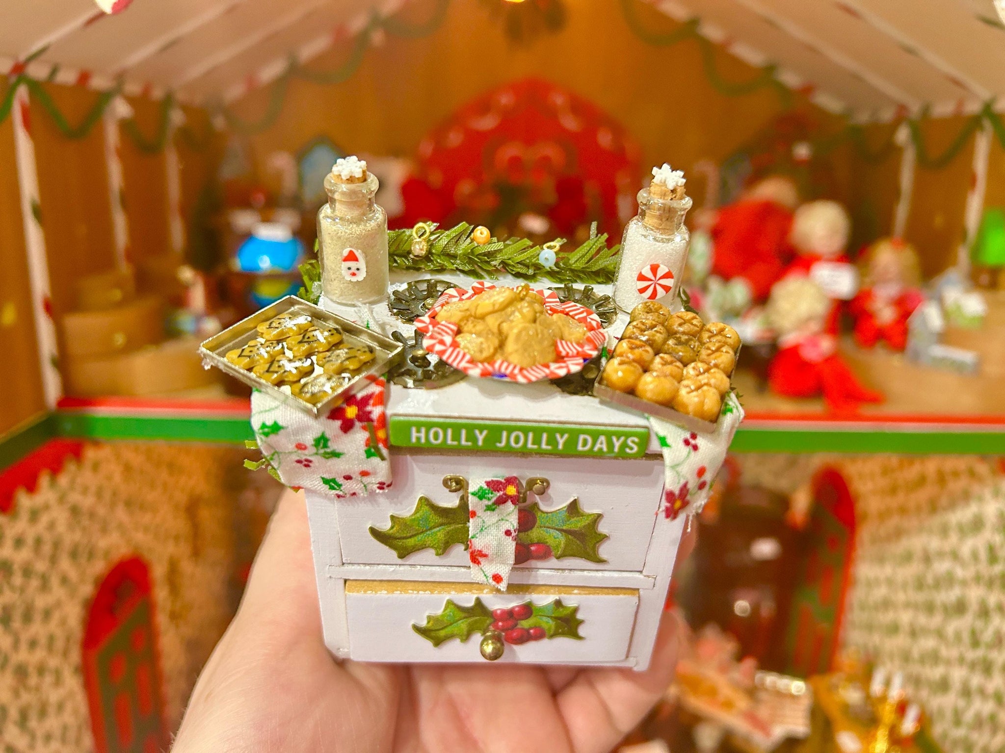 This is a 6 piece decorated kitchen set. The set includes a stove, fridge, sink, table, and two chairs. Each piece is decorated for Christmas and has Christmas decals, holly, and other accessories attached. This is a one of a kind set.
