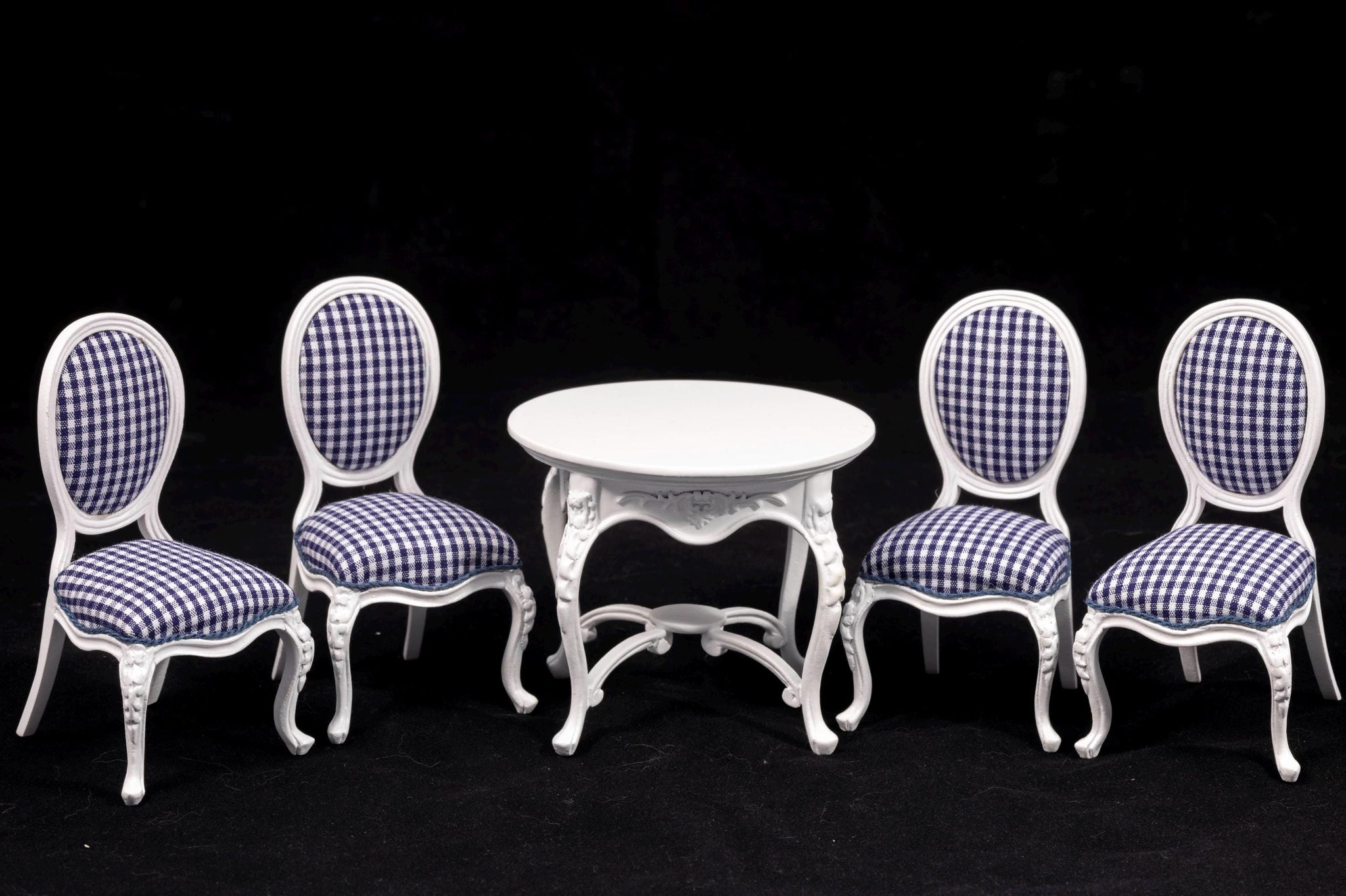 This is a really wonderful set, absolutely beautiful! 8 Piece white kitchen set with a stove with surround, island with built in sink, two stools, a table and chairs with blue checkered fabric. (If you're interested in just the table and chairs or ktichen set, please let us know).