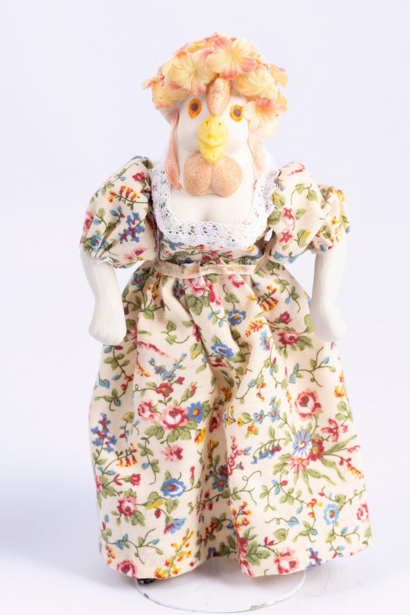 This is a hand made porcelain anthropomorphic chicken doll. One is wearing a blue checkered dress, the other a floral dress. They are supposed to be similar to Henny Penny. Chicken dolls with bonnets.