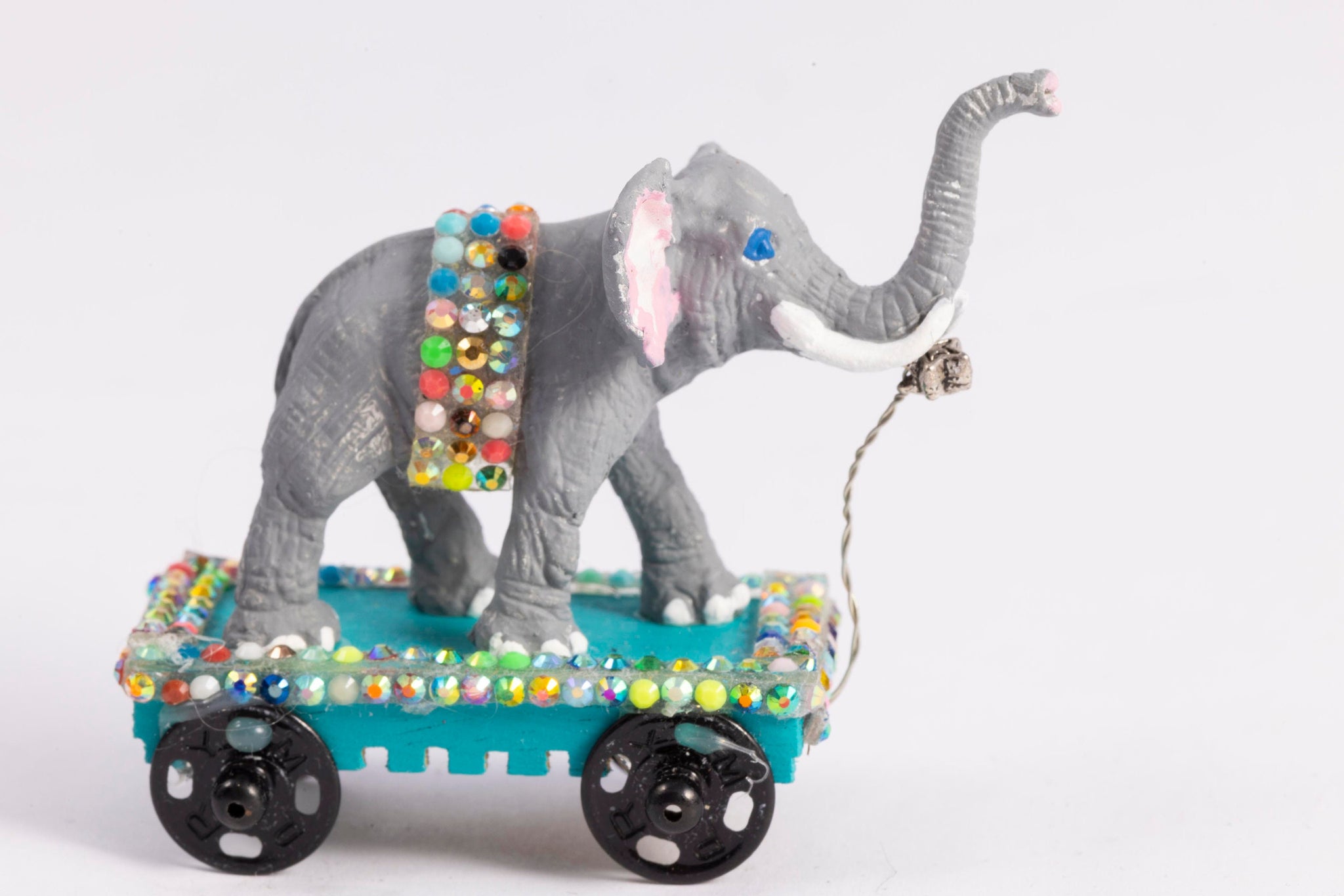 This is a hand painted metal elephant pull toy. No longer available, last one I have.