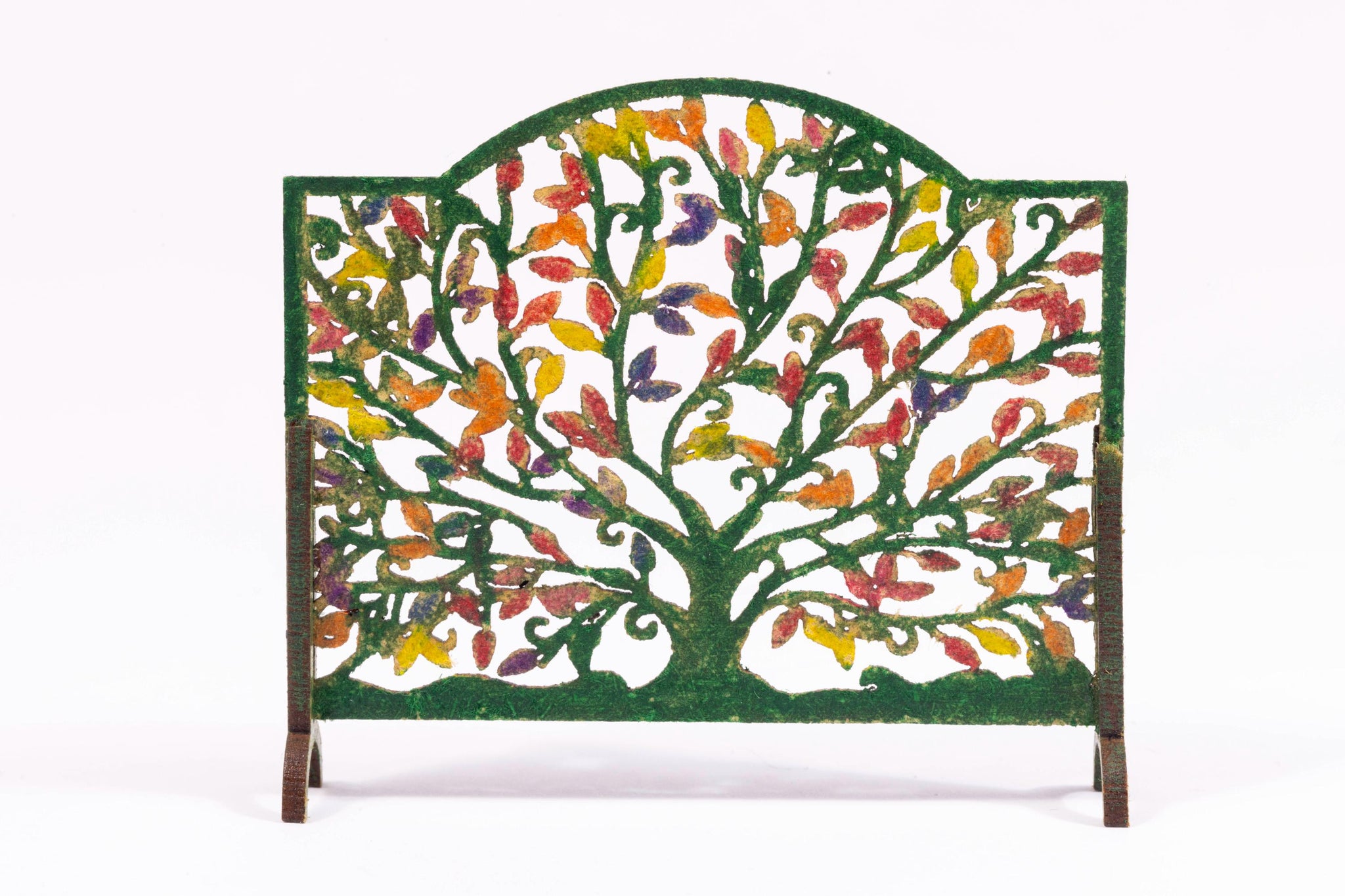 Dollhouse Miniatures ~ 1/12 Scale This is a wonderful hand painted laser cut fire screen. Autumnal colors in the tree. Approximately Measures: 2 3/4" x 5/8" x 2 1/2" tall