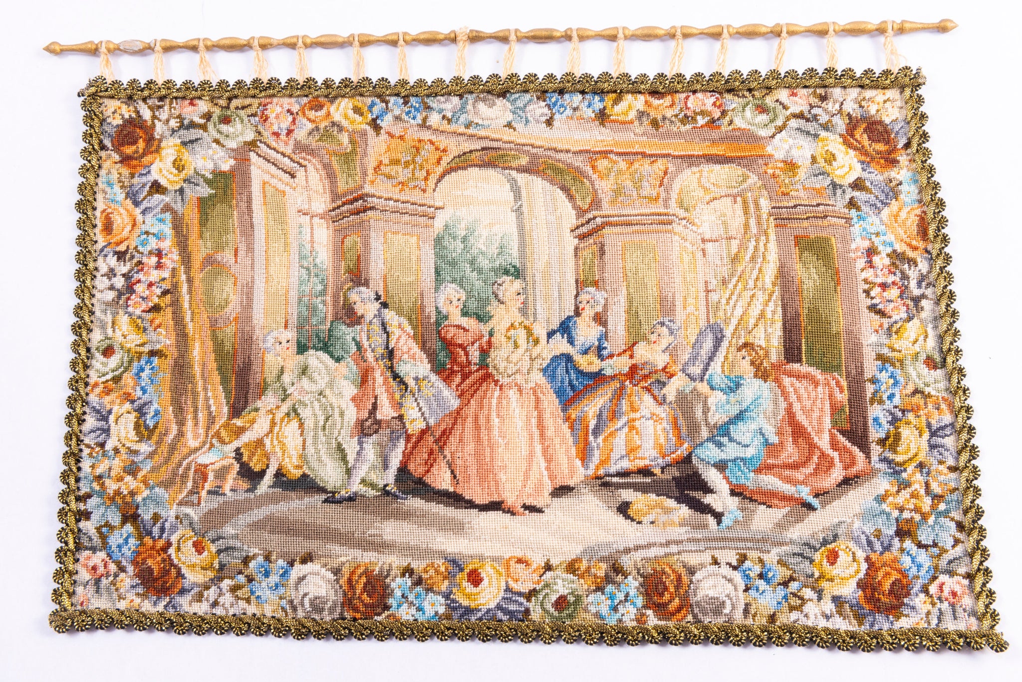 Beautiful petit point tapestry with ladies and gentlemen. Roses decorate the border of the tapestry. There's a painted gold wooden rod that's been repaired. Beautiful work by Ursula Sauerberg. She did needlepoint/petit point every day of her life. Just beautiful.