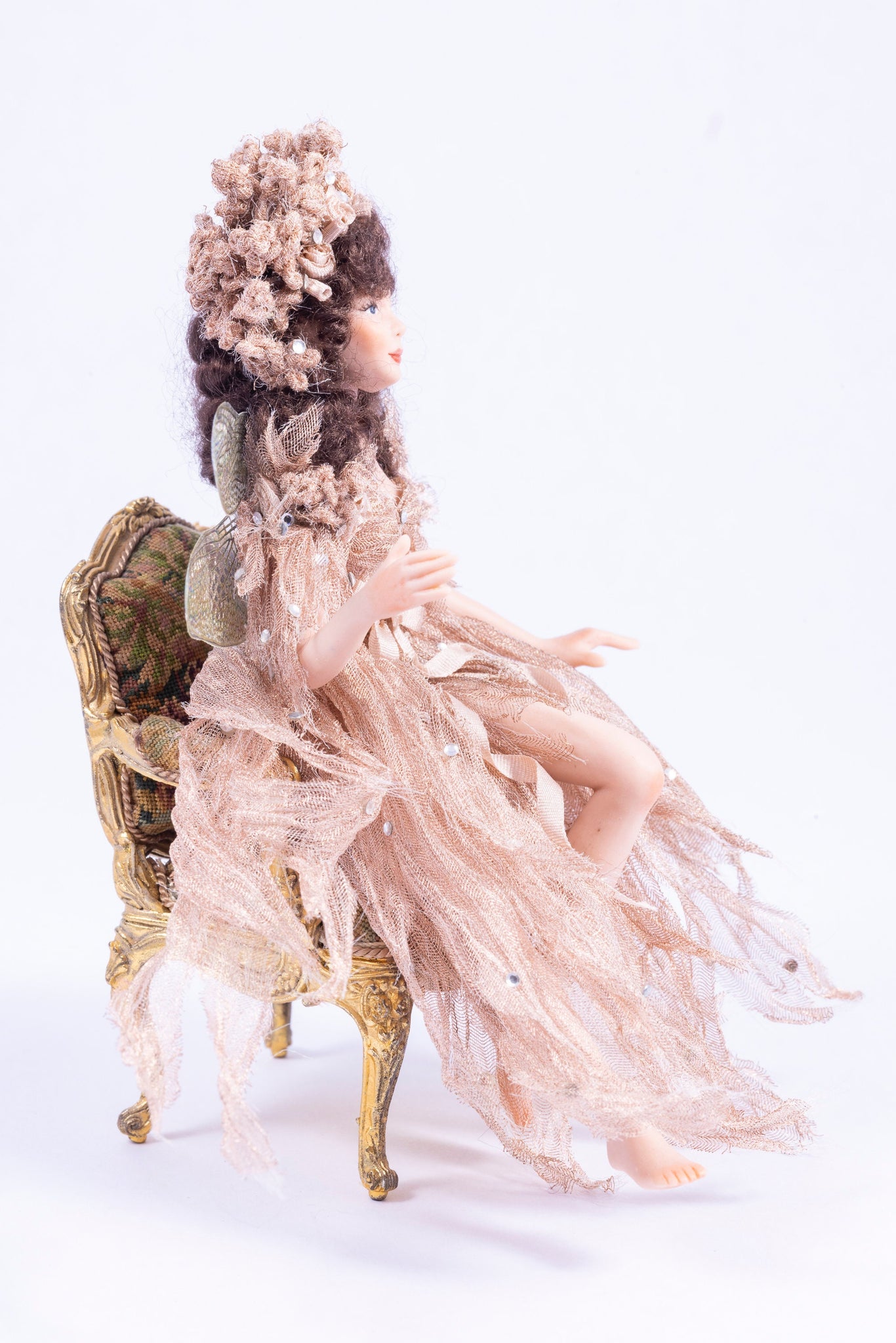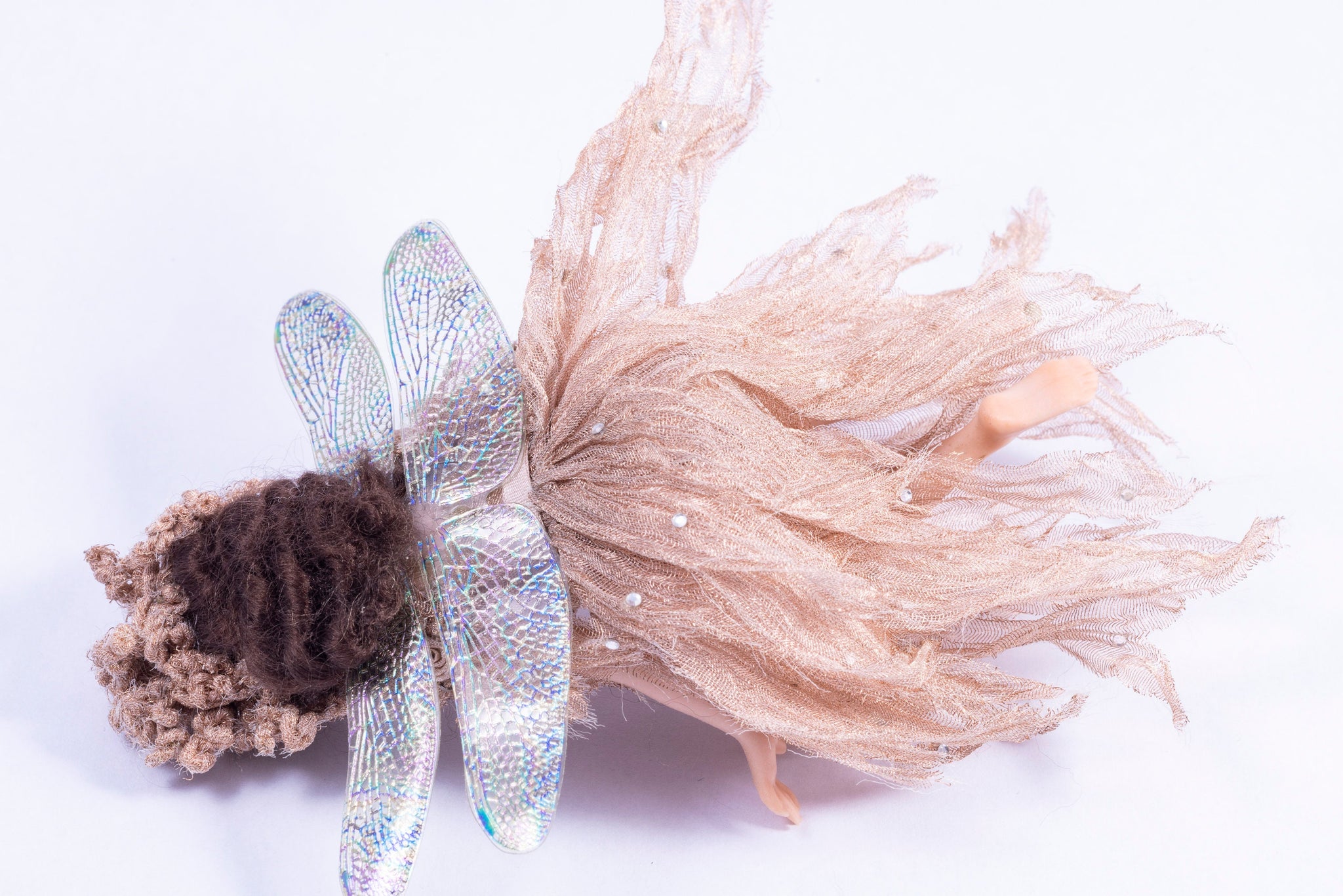 This is a hand made porcelain doll. She's just terrific. She has wings and a silk flowers in her hair. Her dress is wonderful and her wings as well.
