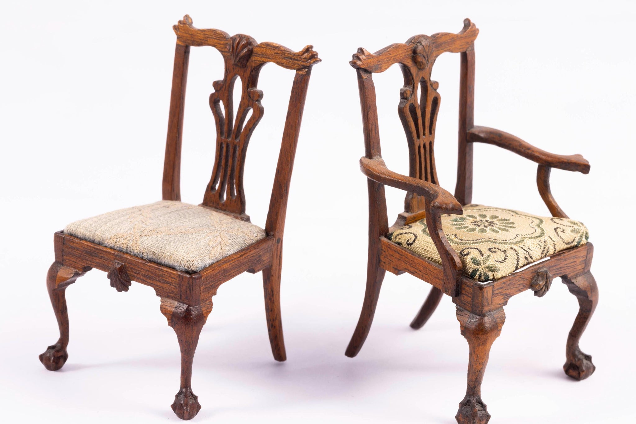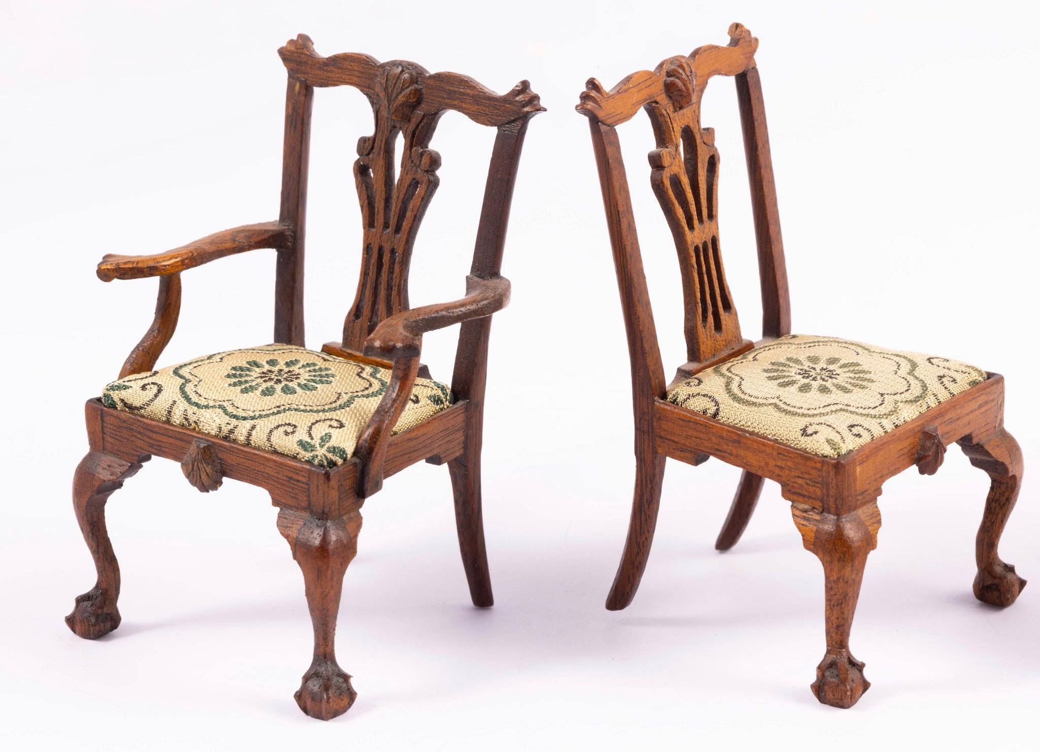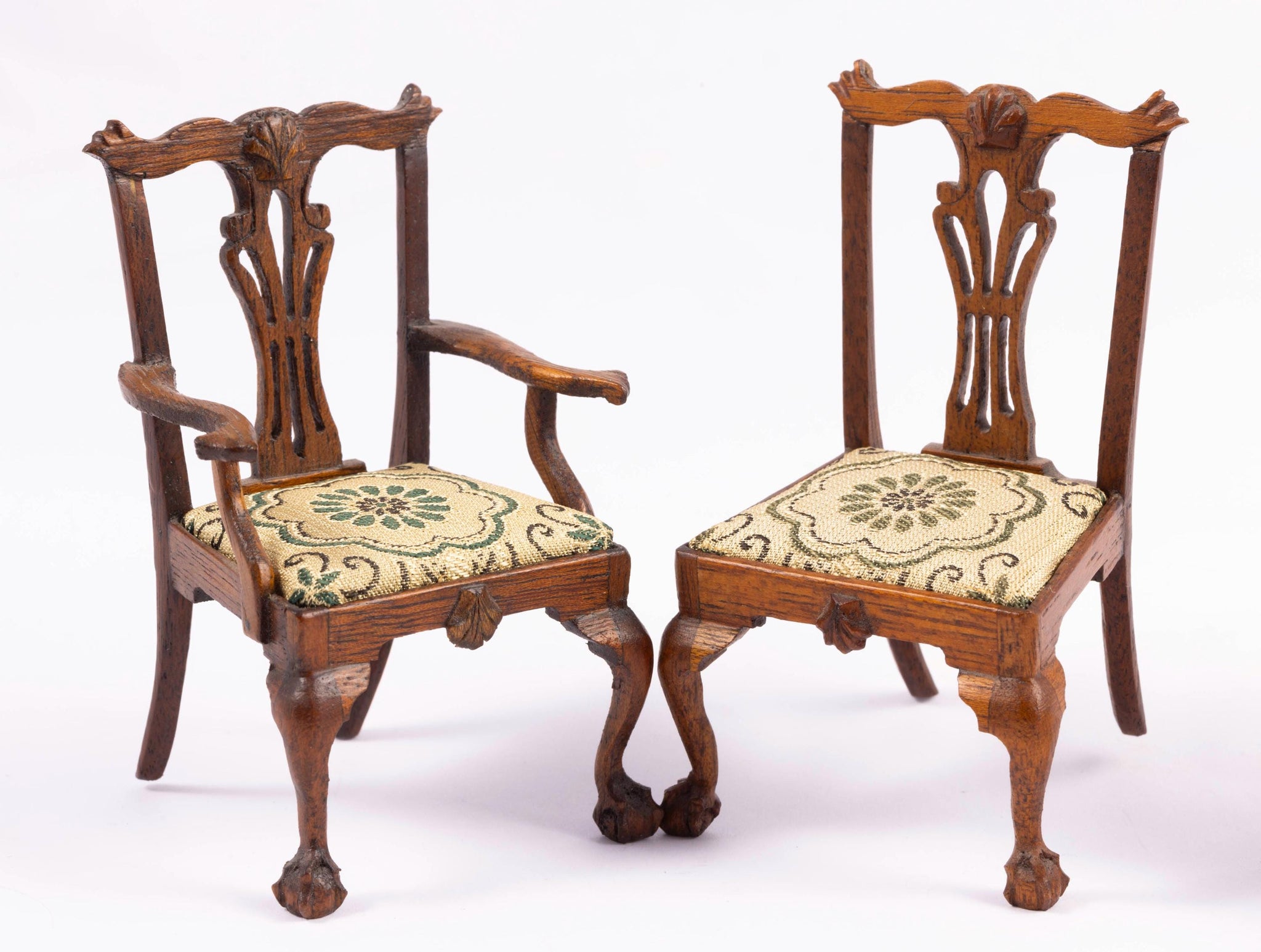 This is a handmade set of four Betty Valentine chairs. Two arm chairs, two side chairs. The seat cushion doesn't match the other three. Slight sun fading in one chair. They are all hand carved by Betty Valentine, from the 1980's. The chairs can all be upholstered with new covers as the seats are not attached.