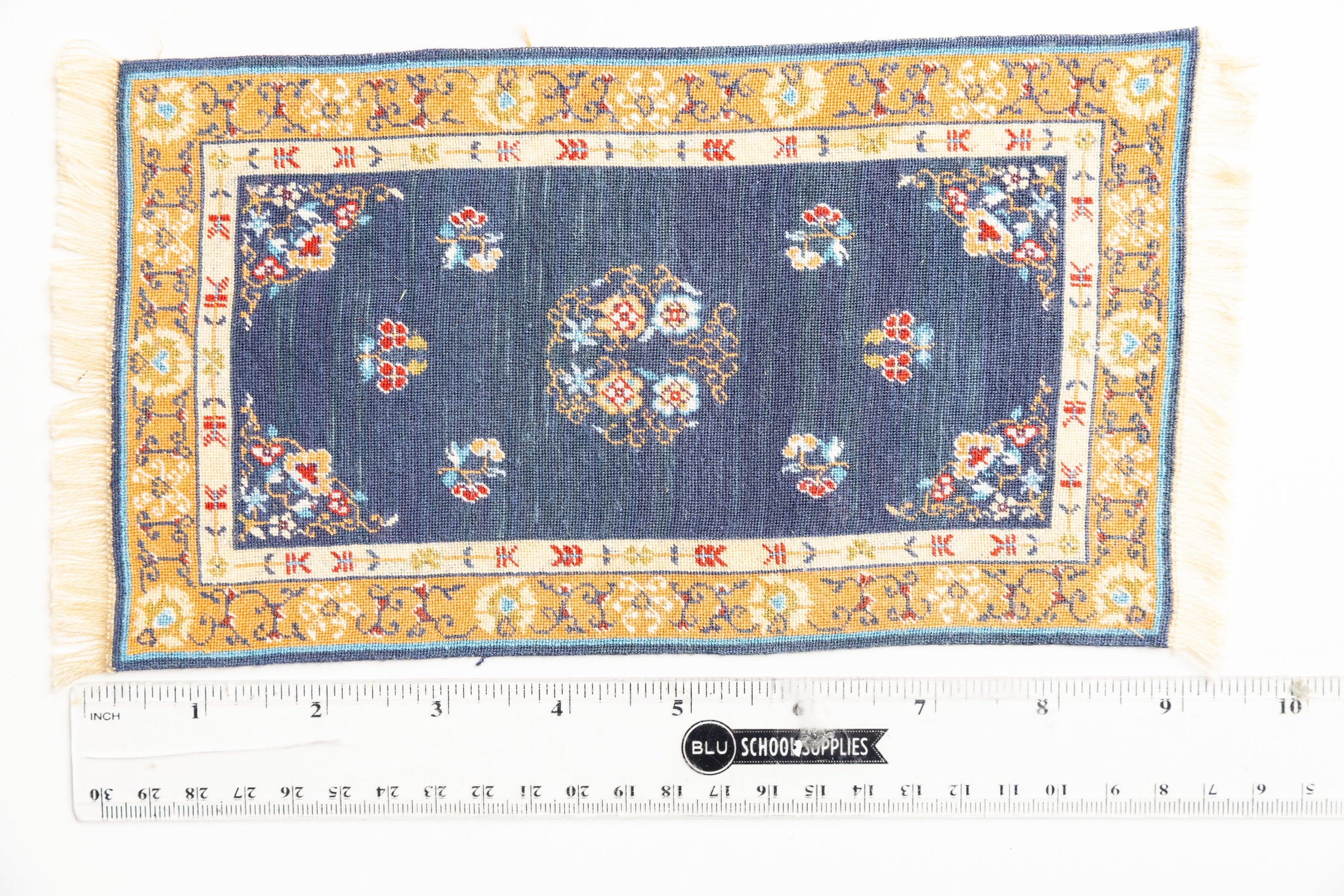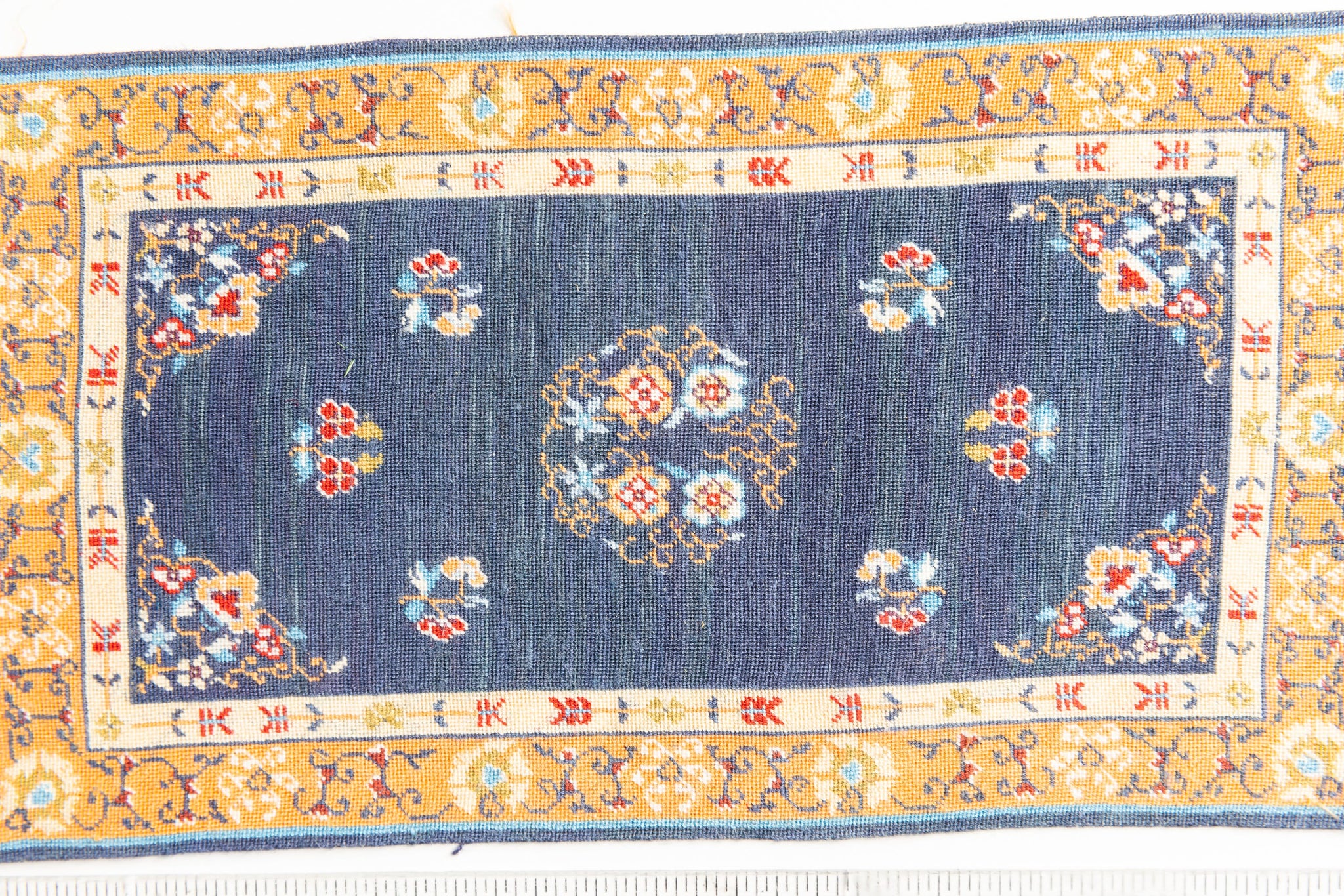 Beautiful petit point rug with blues, dark blues, peach, bits of red, green, golden and white. Note, this is photographed lighter than the actual rug, darker in person. Beautiful work by Ursula Sauerberg. She did needlepoint/petit point every day of her life. Just beautiful.