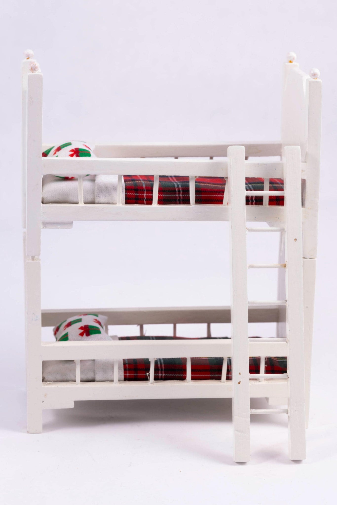 This is a wonderful hand dressed bunk bed set for Christmas. Either elves or children could use the bunk bed. The bed is not connected, so you can have 2 small children's beds in the room. Ladder is not attached. The bedding is plaid, and the pillows have presents on them.
