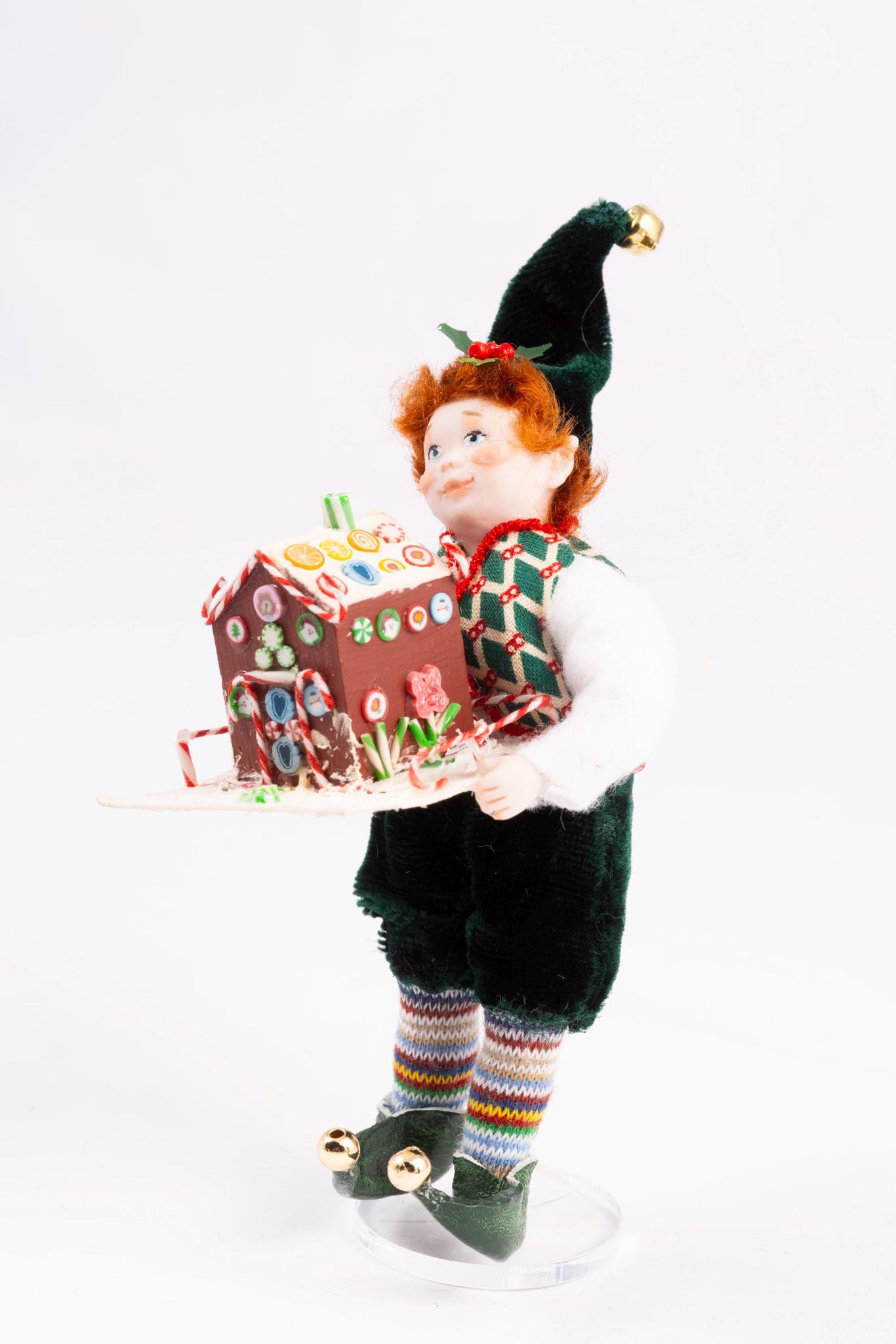 These are hand made porcelain elf doll by Fern Vasi. He's holding a wonderful gingerbread house. Beautifully dressed with elf shoes.