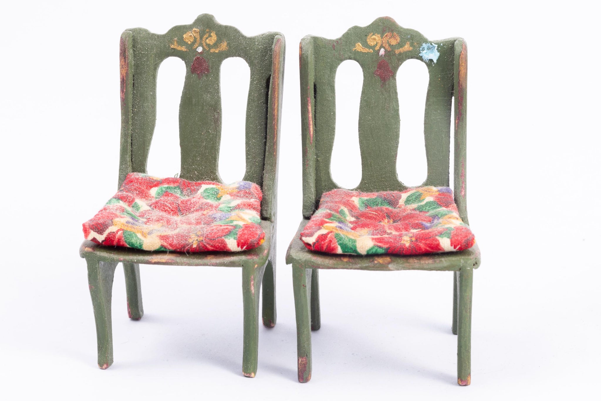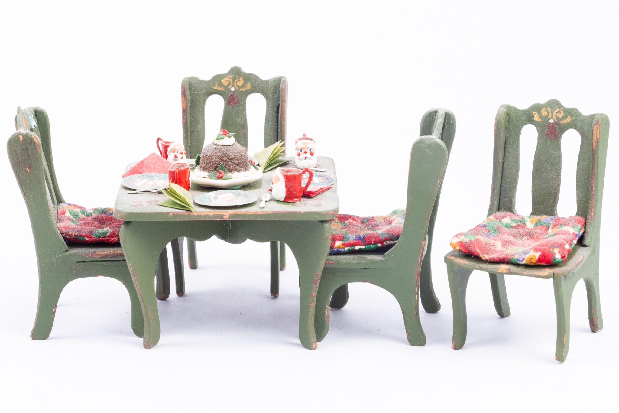 This is a wonderful hand painted table and chairs set with cushions. There's a plum pudding in the center, four paper plates, four spoons, four Santa cups that are hand painted. Ursula Sauerberg estate.